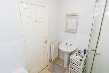 Bathroom - Tiled shower cubicle with mains shower fitment. Panelled bath. Pedestal wash hand basin. Low level WC. Complementary tiling. Extractor fan. Radiator.