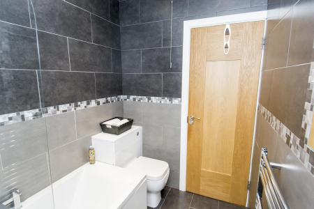 Bathroom - Pannelled bath with electric shower fitment over. Wash hand basin with vanity unit below. Low level WC. Heated towel rail. Complementary tiled floor and walls. Ceiling down lighters. Opaque double glazed window to the side elevation.
