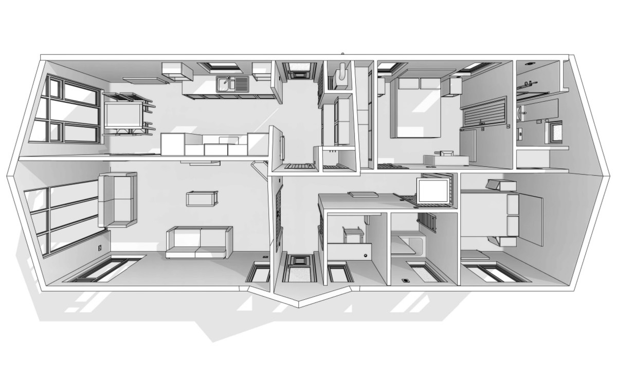 - Open-plan living room with full-height windows, leading to kitchen/diner