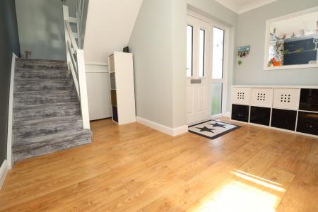 HALL With staircase to the first floor, understairs storage cupboard, double glazed window to the side aspect, wood effect flooring and radiator.