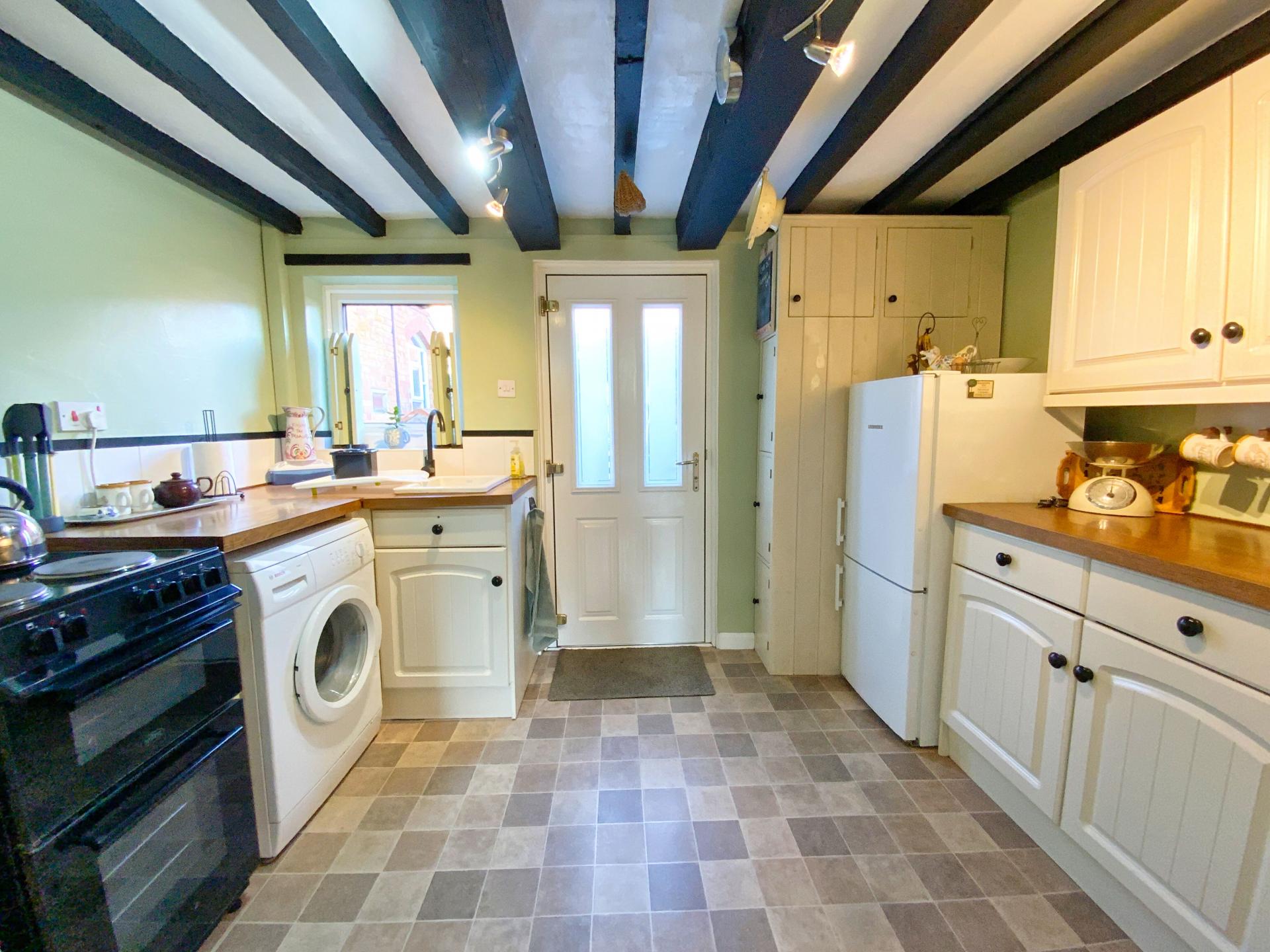 - Modern fitted kitchen with wooden work surfaces, ceramic sink & rear garden access