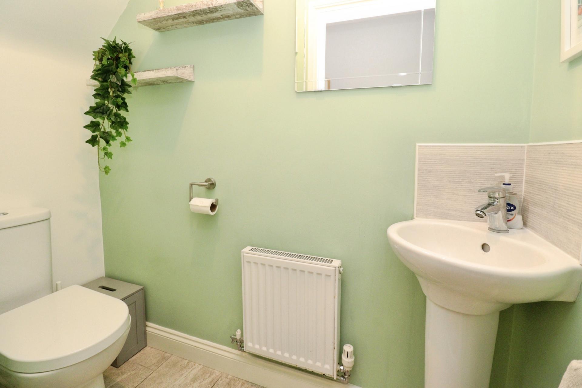 CLOAKROOM/WC With close coupled WC, wash hand basin, tiled flooring and splashbacks and radiator.