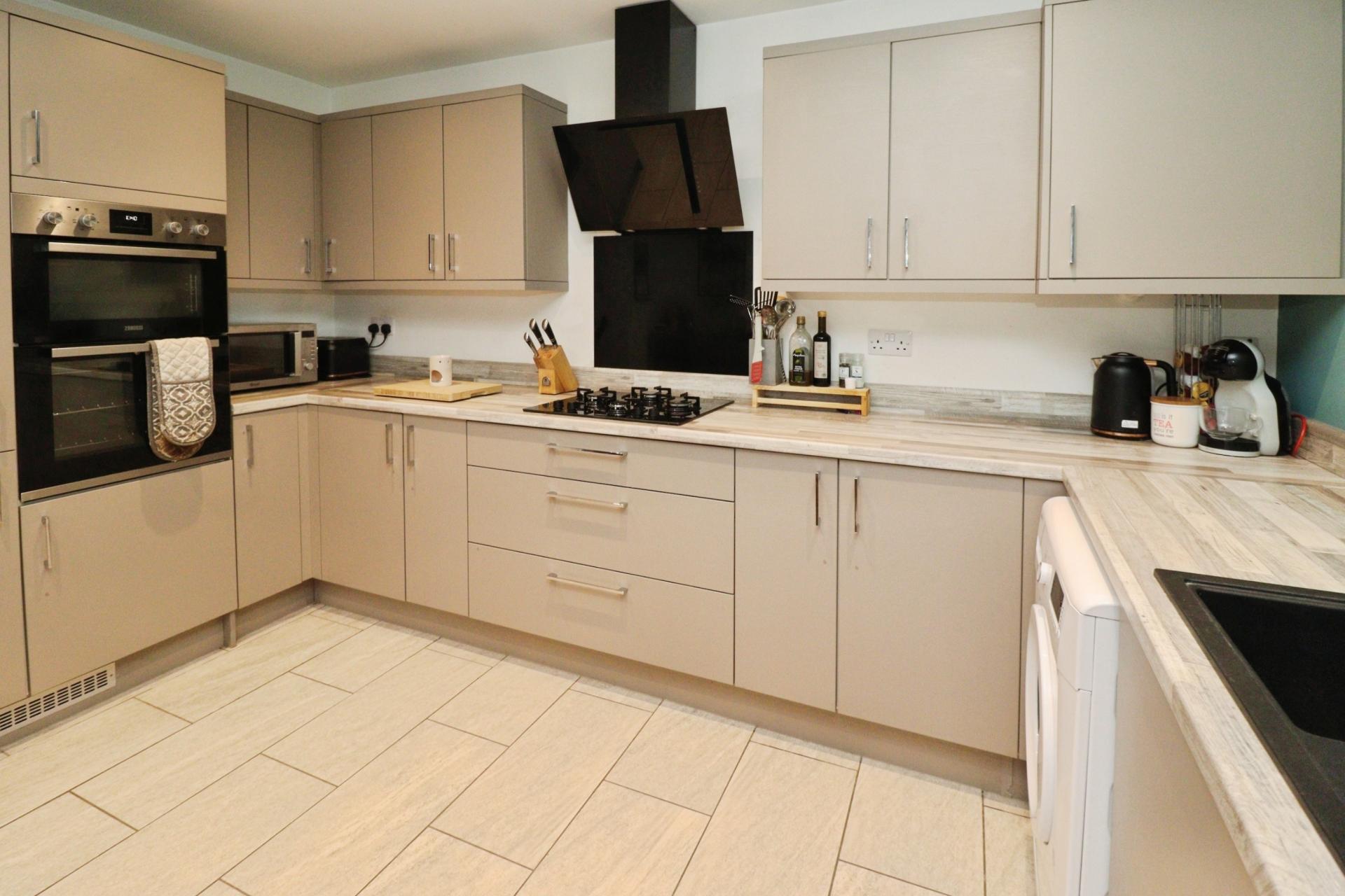 KITCHEN/DINER 13' 2" x 12' 6" (4.02m x 3.83m) Fitted with a range of wall and base units with work surfaces over, 1 1/2 bowl sink with side drainer and mixer tap over, eye level electric oven, gas hob with extractor fan over, integrated fridge freezer and dishwasher, space for washing machine, tiled flooring, spotlights radiator and double glazed bay window to the front aspect.