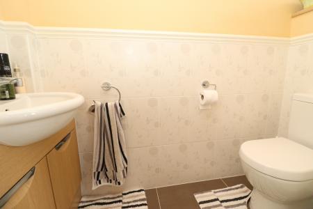 CLOAKROOM/WC With close coupled WC and wash hand basin in a vanity unit with storage beneath, part tiled walls, tiled flooring, radiator and double glazed window to the front aspect.