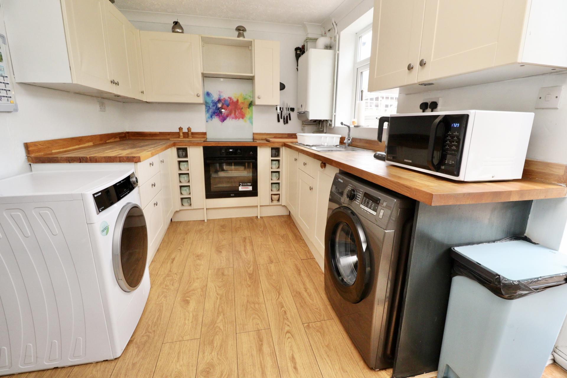 KITCHEN/DINER 17' 0" x 8' 0" (5.20m x 2.44m) Fitted with a range of wall and base units with work surfaces over, stainless steel 1½ bowl sink with side drainer and mixer tap over, electric oven and hob, integrated slimline dishwasher, spaces for washing machine and fridge freezer, wall mounted gas fired central heating boiler, understairs storage cupboard, laminate flooring, double glazed window to the rear aspect and double glazed sliding patio doors to the rear garden.