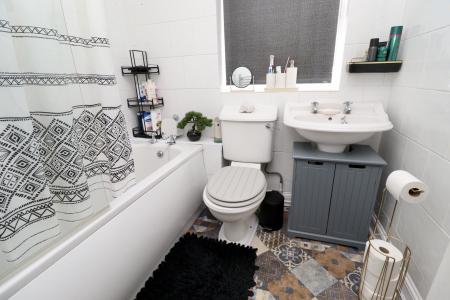 BATHROOM Fitted with a three piece suite comprising of panelled bath with shower over and glass shower screen, close coupled WC and pedestal wash hand basin, tiled walls, towel radiator and double glazed window to the front aspect.