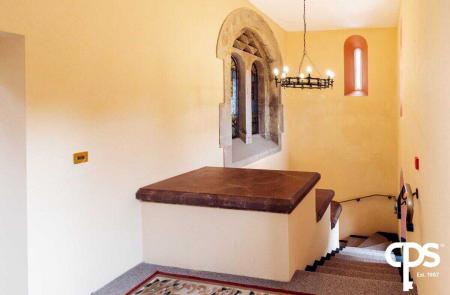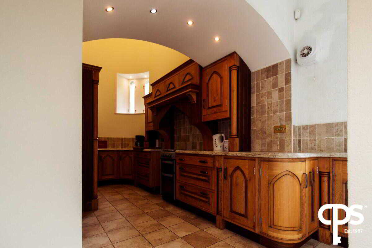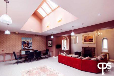 To the top floor of this unique property is an outstanding piece architectural design to provide a room that can be utilised as an additional reception room/function area. To the area which is currently be used as a living space comes with carpeted flooring throughout and houses an open fireplace which sits on a slated hearth and granite mantelpiece surround. The room is radiated with natural light with its fitted sky lights and stained glassed windows surrounding. This room can be accessed by the old-fashioned spiral staircase or via the lift while also benefits with a slightly raised area in the tower of the castle.