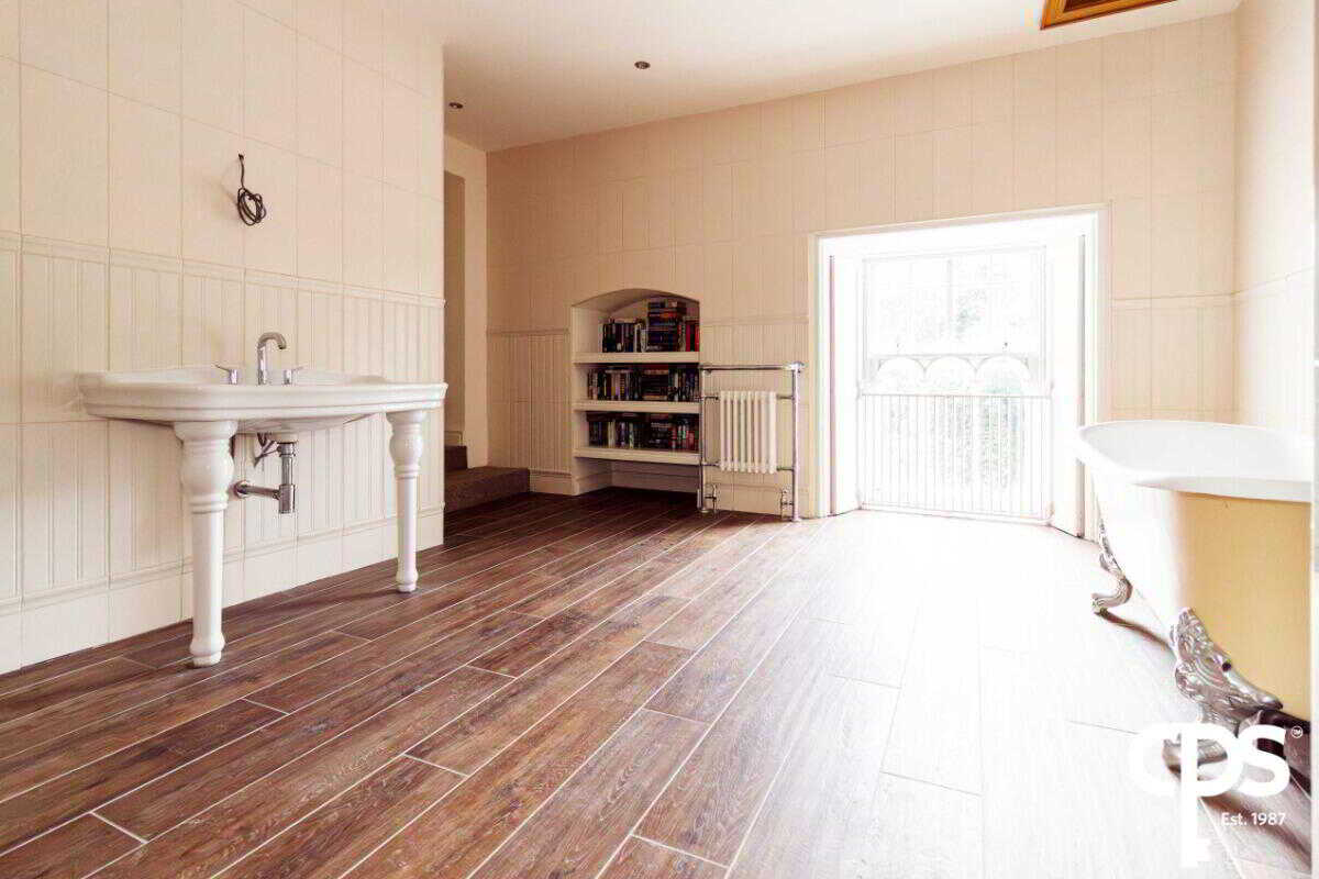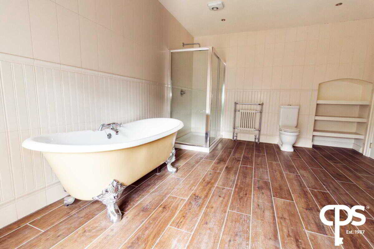 This large top floor bathroom comprises of a four-piece suite to include W/C, hand wash basin, corner power shower and bespoke large bath. The bathroom comes with wooden styled tiled flooring throughout with fully tiled décor surrounding.