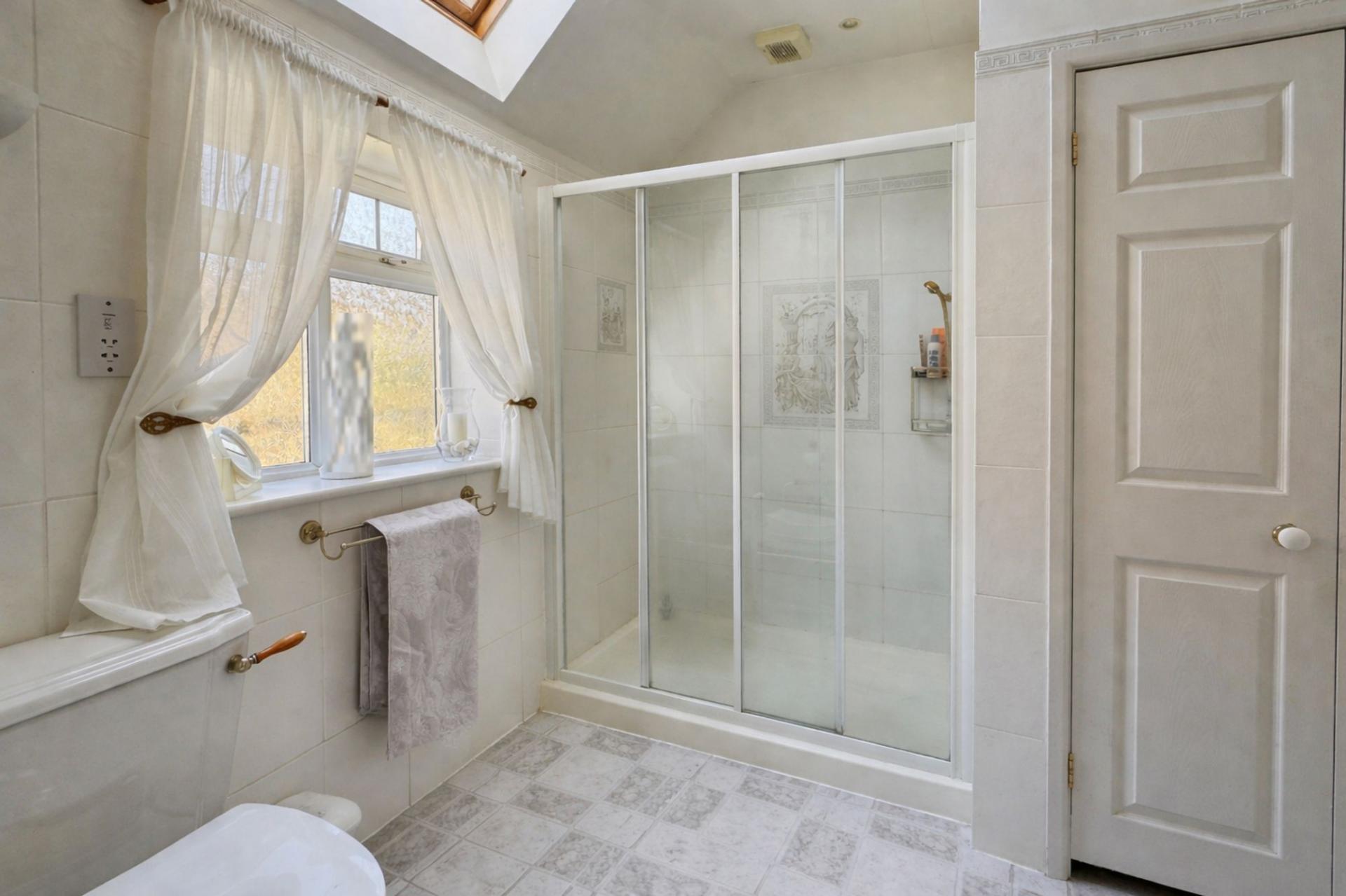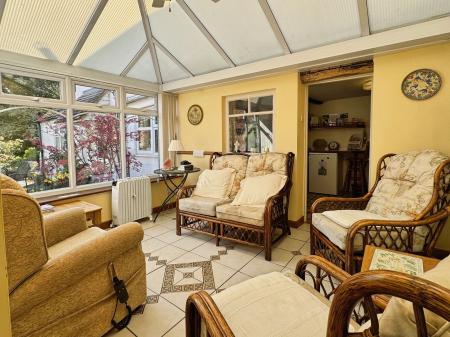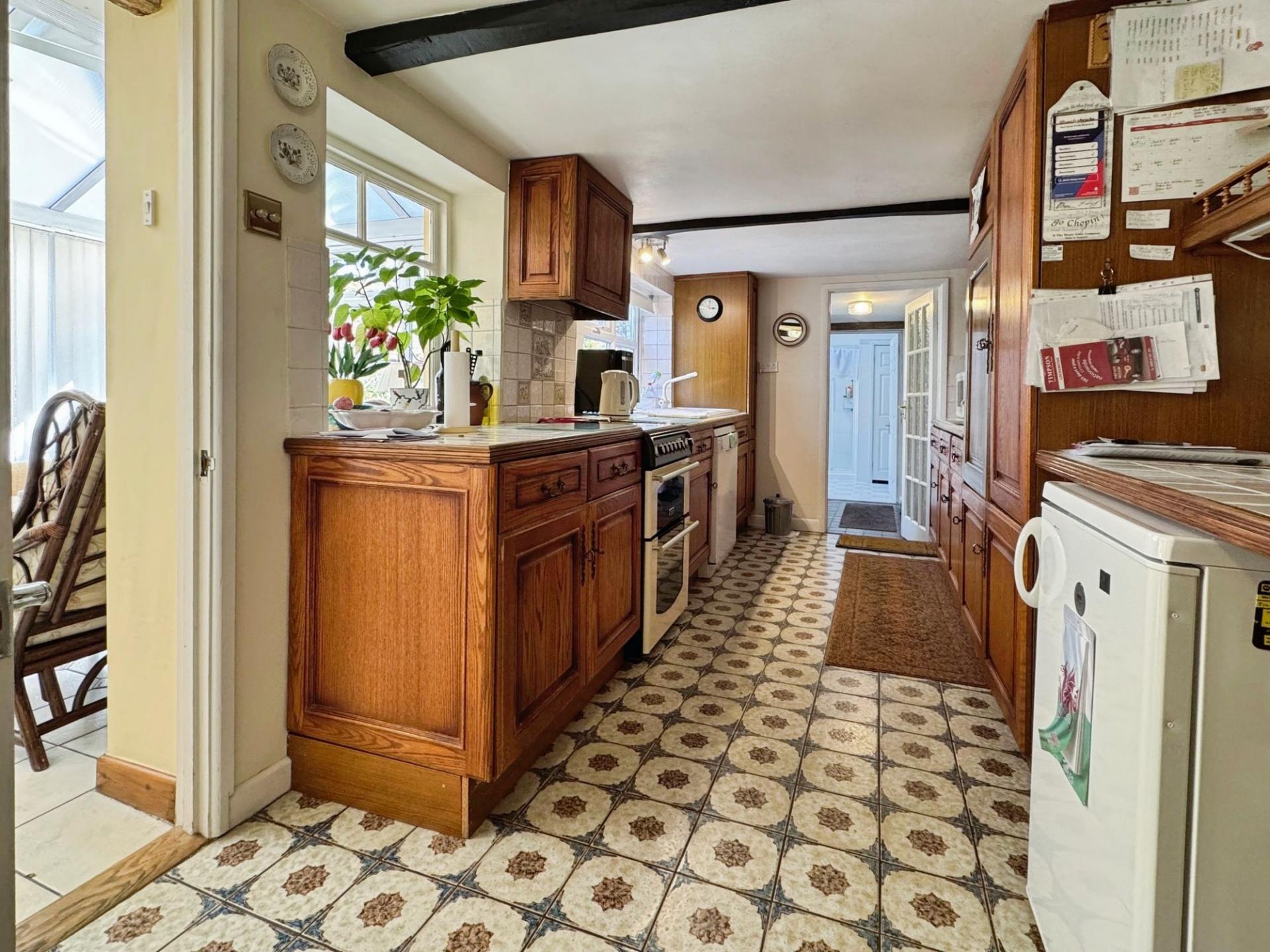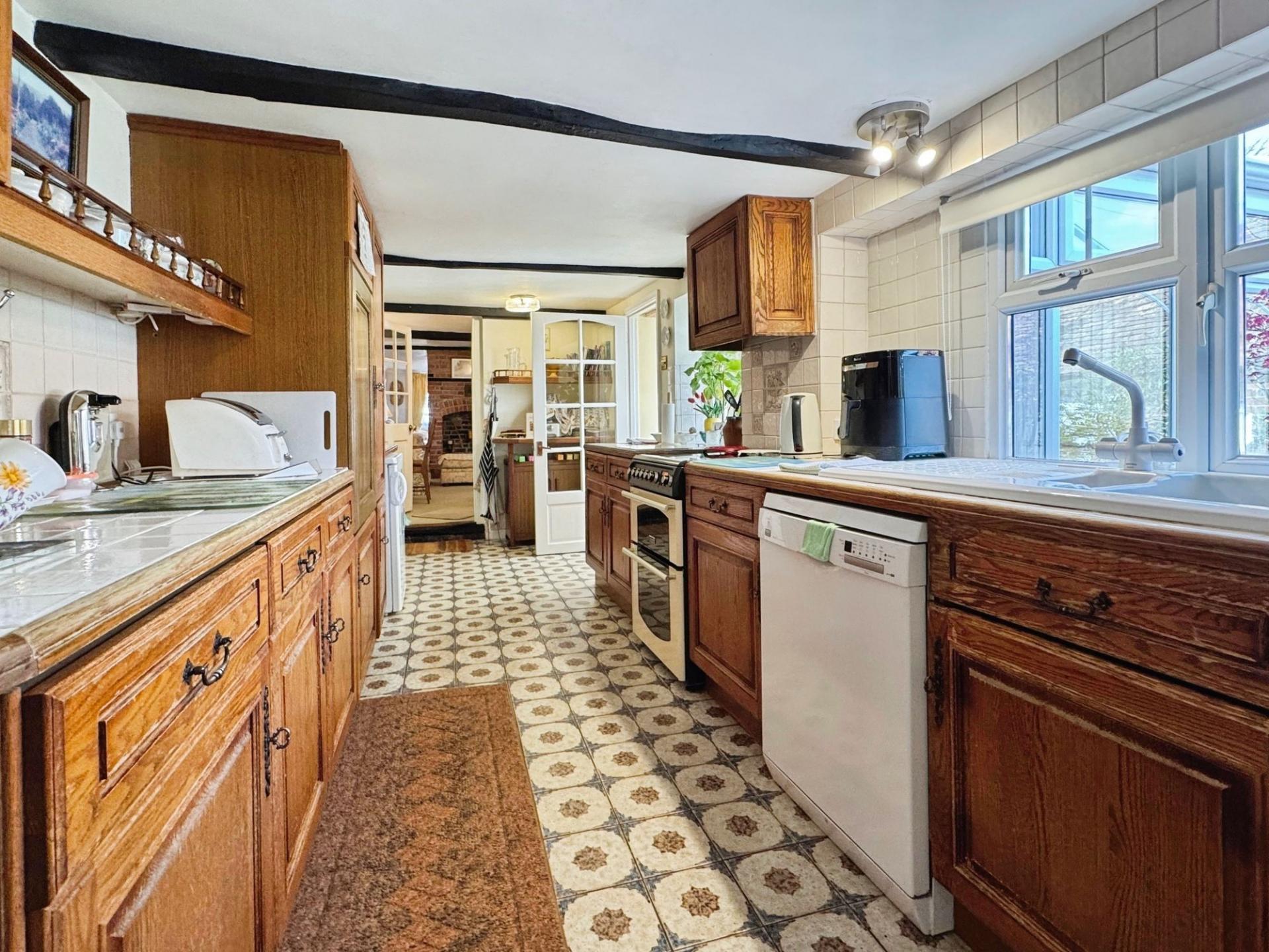 A more recent addition is the glazed conservatory, which enjoys fabulous views over the garden and beyond, providing a delightful link through to the kitchen. The kitchen itself is full of character, well-appointed with a range of fitted cabinetry, tiled work surfaces, original oak beams, and attractive tiled flooring. A short inner hallway leads to a spacious shower room and a practical utility area with additional storage and a sink. The property further benefits from a large, dry cellar.