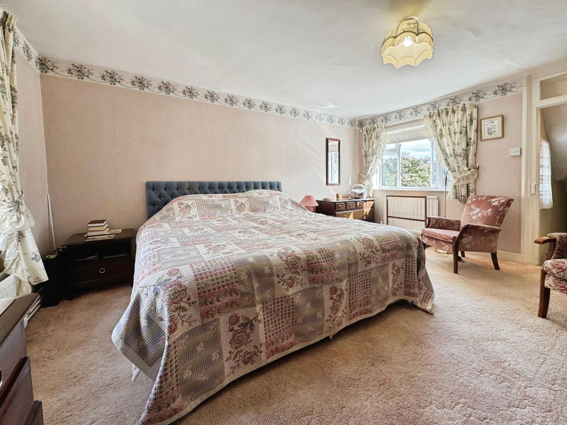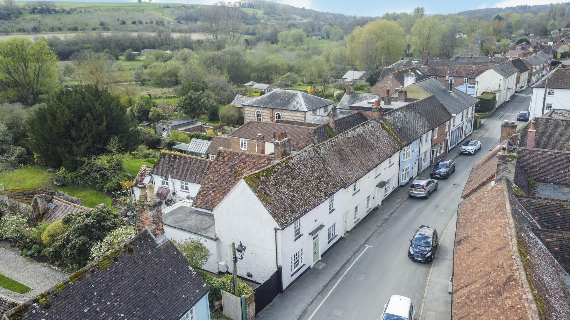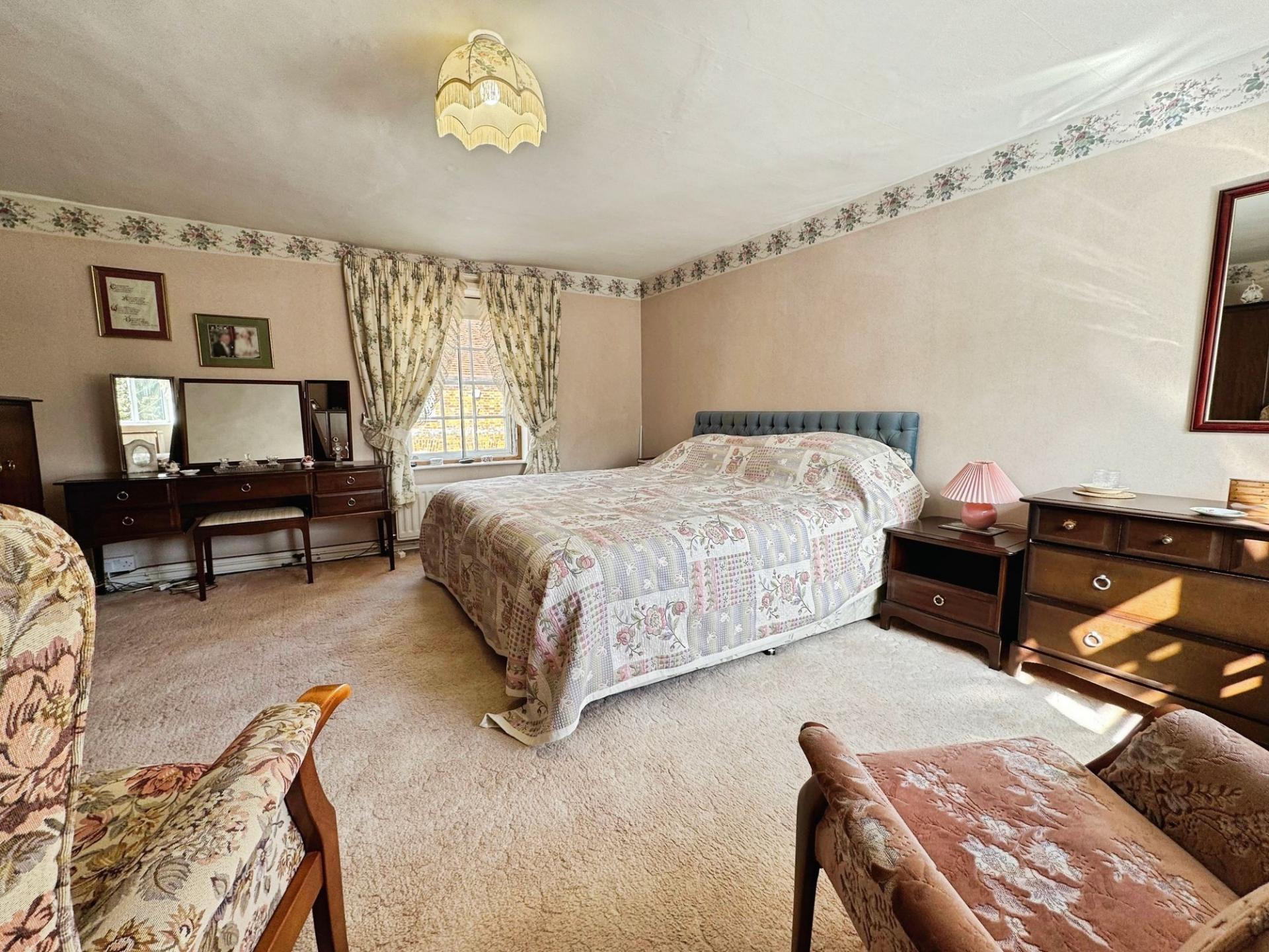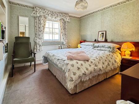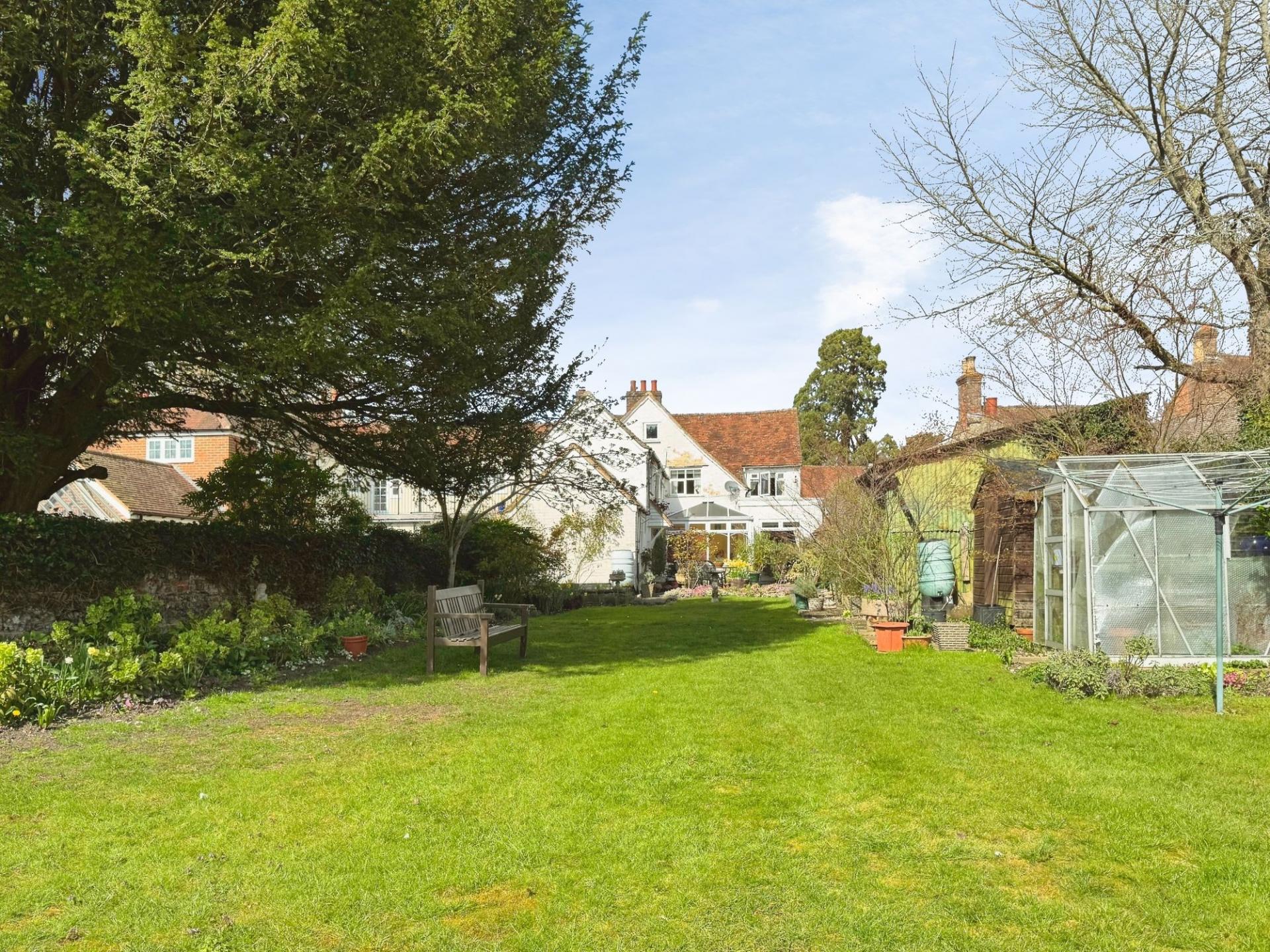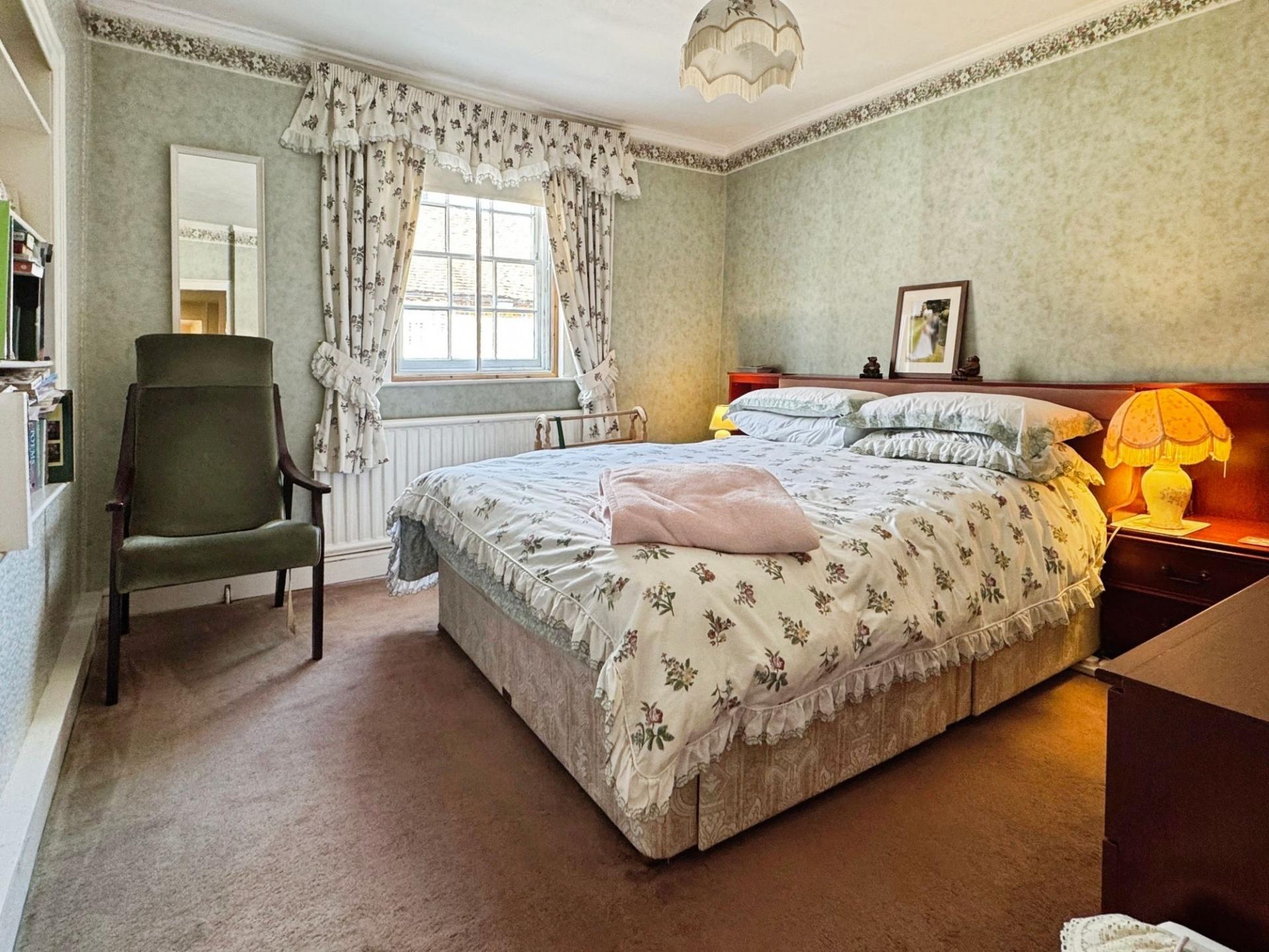 Upstairs, the first floor offers four generously sized bedrooms, complemented by a family bathroom and an additional shower room. The two front double bedrooms feature fitted wardrobes and enjoy views over the High Street, both benefitting from high ceilings. The principal bedroom is particularly spacious, with a dual aspect providing views to the front and across the rear, where terracotta rooftops lead the eye towards the garden and far-reaching countryside beyond. Each bedroom enjoys an interesting and varied outlook.