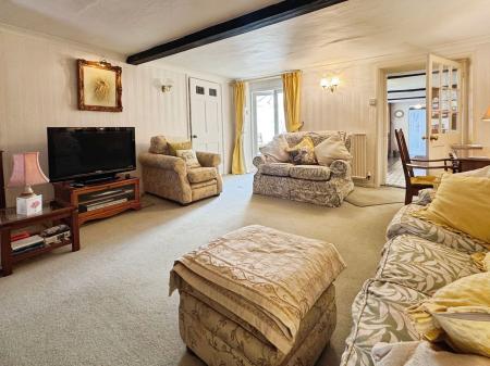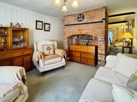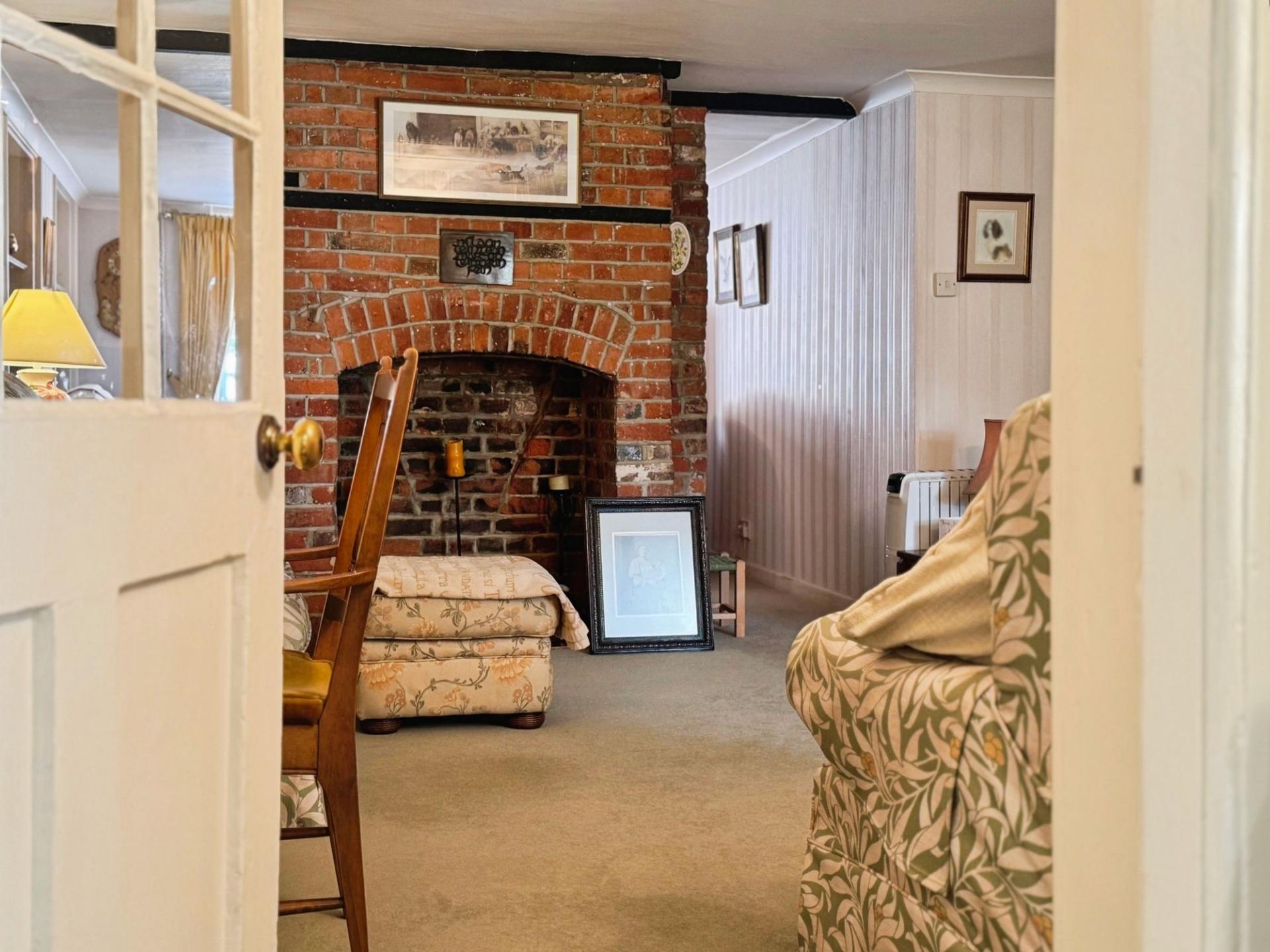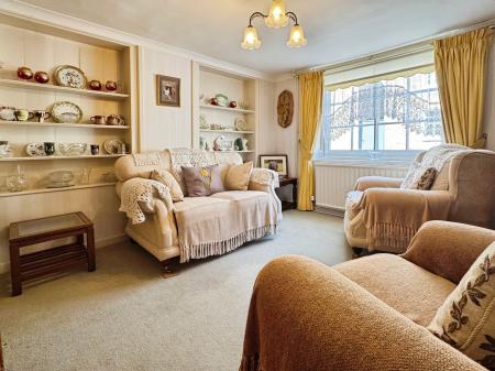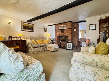 Beyond the kitchen is a cosy carpeted sitting room, featuring an exposed brick hearth that subtly divides the space from a charming snug at the front of the property. This area, formerly a shoe shop, retains lovely original shelving - a delightful nod to its past - along with sash windows and secondary glazing overlooking the High Street.