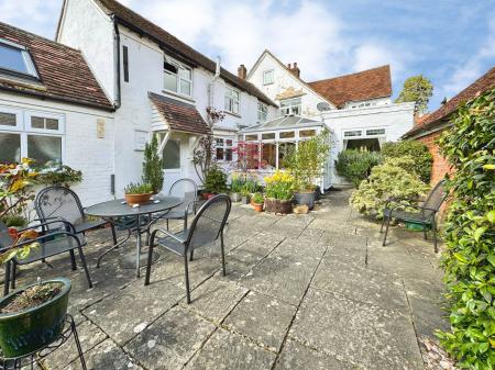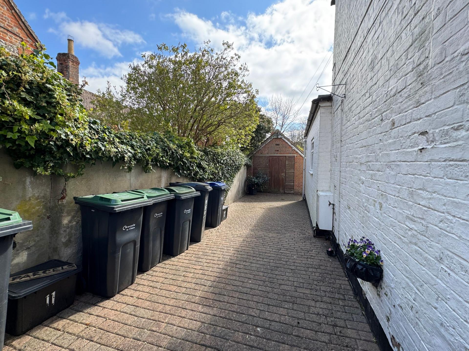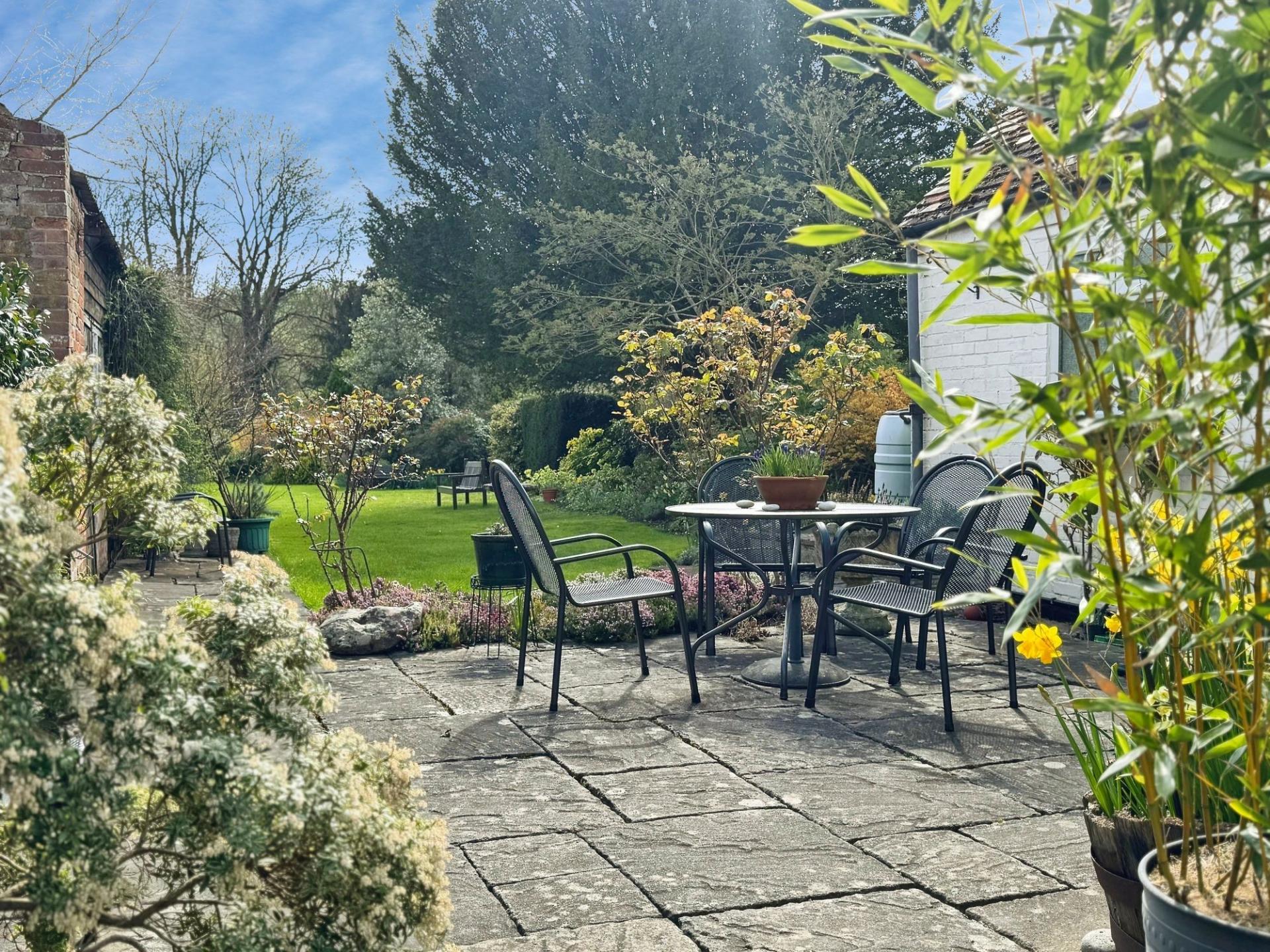 To the side, gated access leads to a paved area providing parking for up to three vehicles. The adjoining patio is a true sun trap, beautifully arranged with mature planting including rose climbers, rosemary, bamboo, and acers, creating a colourful and fragrant outdoor space.