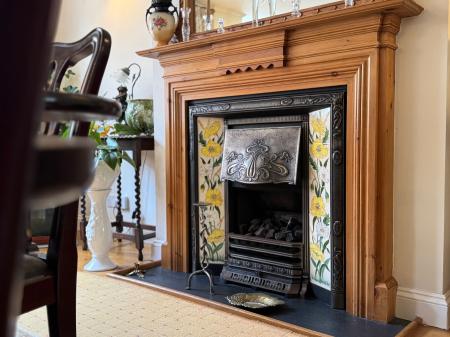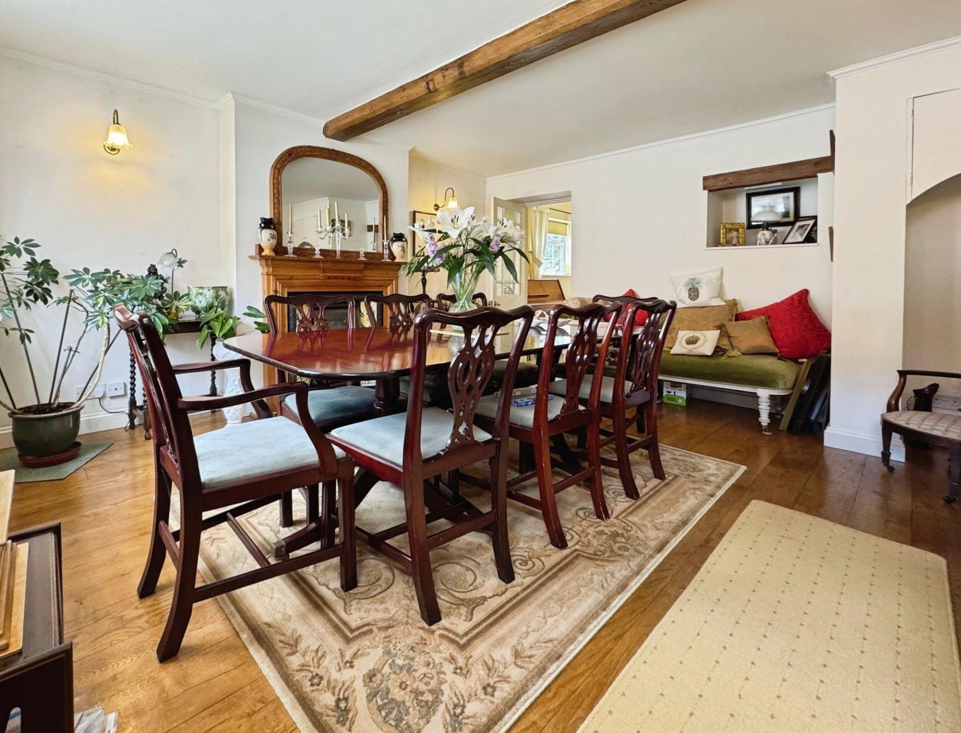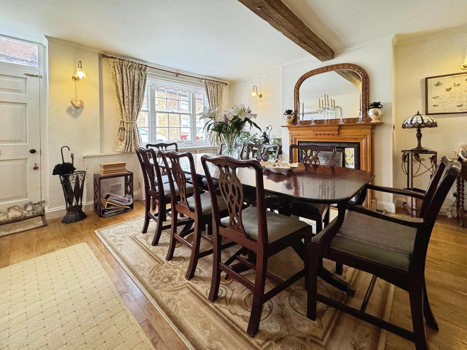 From the welcoming entrance/dining hall through to the dining room-once Mill’s Butchers-the charm of exposed oak beams runs throughout. A beautiful working fireplace forms a striking focal point, complemented by attractive original sash windows overlooking the High Street and solid wood flooring underfoot. The adjoining breakfast room is bright and inviting, featuring tiled flooring and offering a perfect space for informal dining.