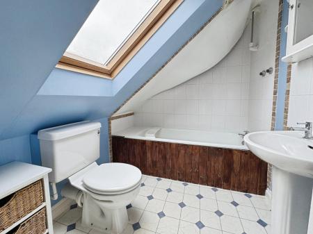 The second floor is dedicated to the principal bedroom suite. A skylight on the landing provides additional natural light, while the bedroom itself features three skylights that frame attractive views towards the village church and the rolling hills beyond. This room also benefits from a private en-suite bathroom with bath.