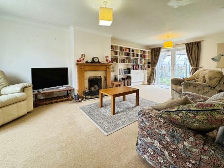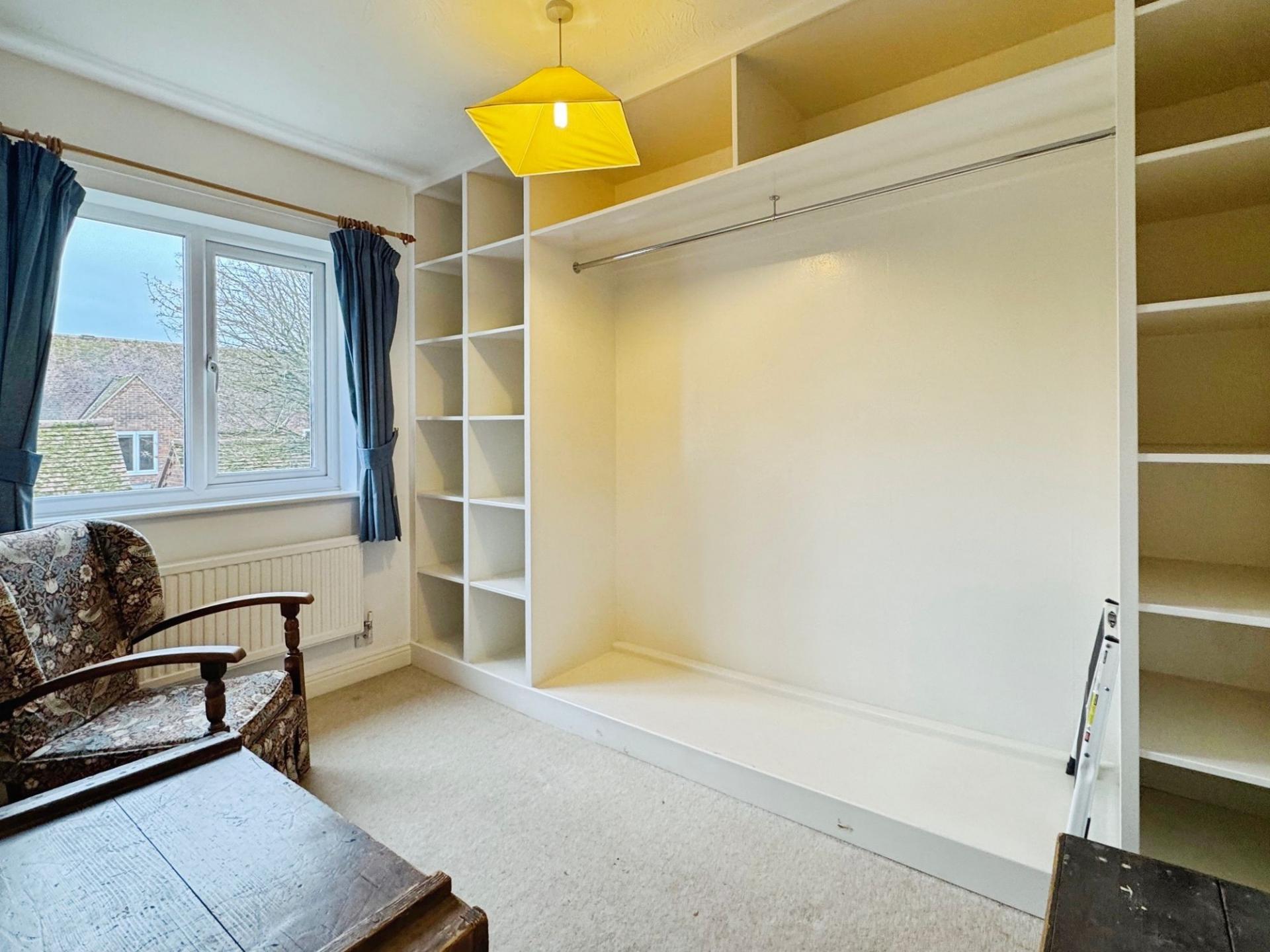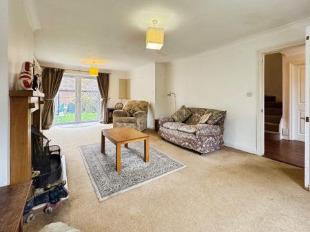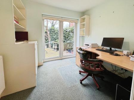 The ground floor also offers two study areas, one with patio doors opening onto the rear patio, providing a bright and pleasant workspace. Leading from the entrance hall, the sitting room runs the full length of the house, with a front window and rear patio doors overlooking the garden. Featuring a focal fireplace, this inviting room is perfect for relaxing or entertaining, filled with natural light. A downstairs cloakroom and a large understairs storage cupboard complete the ground floor.