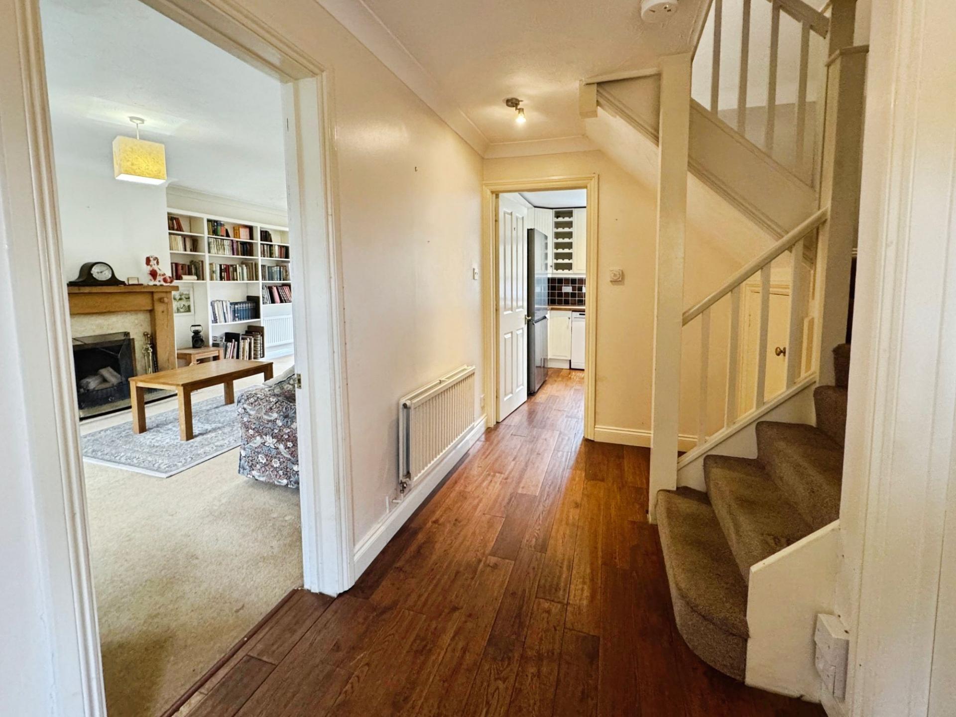 Externally, the south-facing rear garden offers a wonderful space for outdoor living and entertaining, with a combination of lawn and patio areas surrounded by mature shrubs, climbers and trees that create a private and secure setting. A handy lean-to shed sits to the side of the house, providing convenient walk-through access between the front and rear and offering excellent storage for garden equipment, tools, bikes and other outdoor items. To the front of the property there is driveway parking for multiple vehicles.