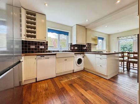 Upon entering the property, you are welcomed by a generous entrance hall which sets the tone for the well-proportioned accommodation. To the rear of the home is a superb kitchen/dining room designed for family life and entertaining. Featuring wooden floorboards, ample storage, a Belfast sink, gas hob and fitted double oven, the kitchen enjoys plenty of natural light and benefits from two sets of patio doors opening directly onto the south-facing garden.