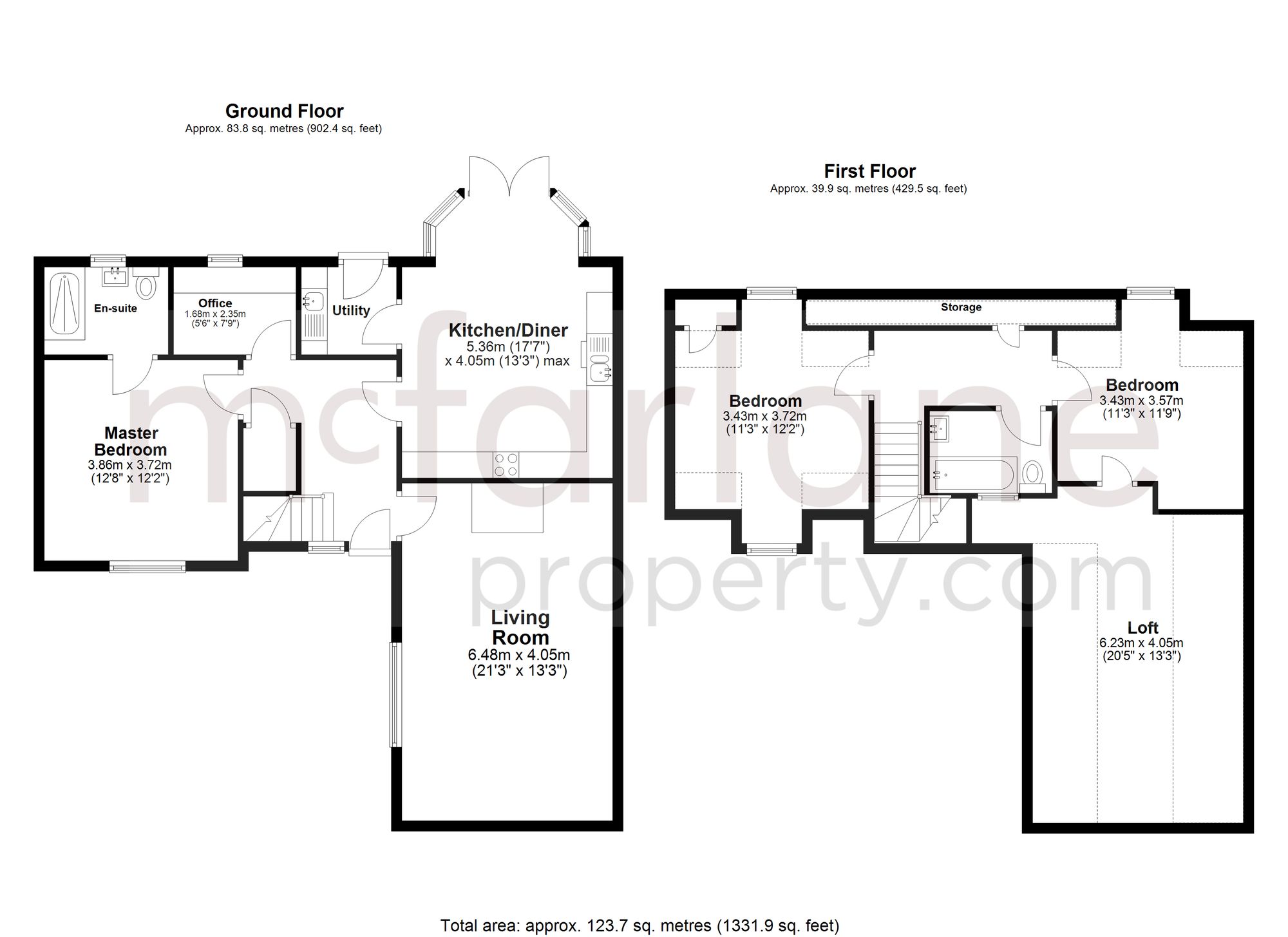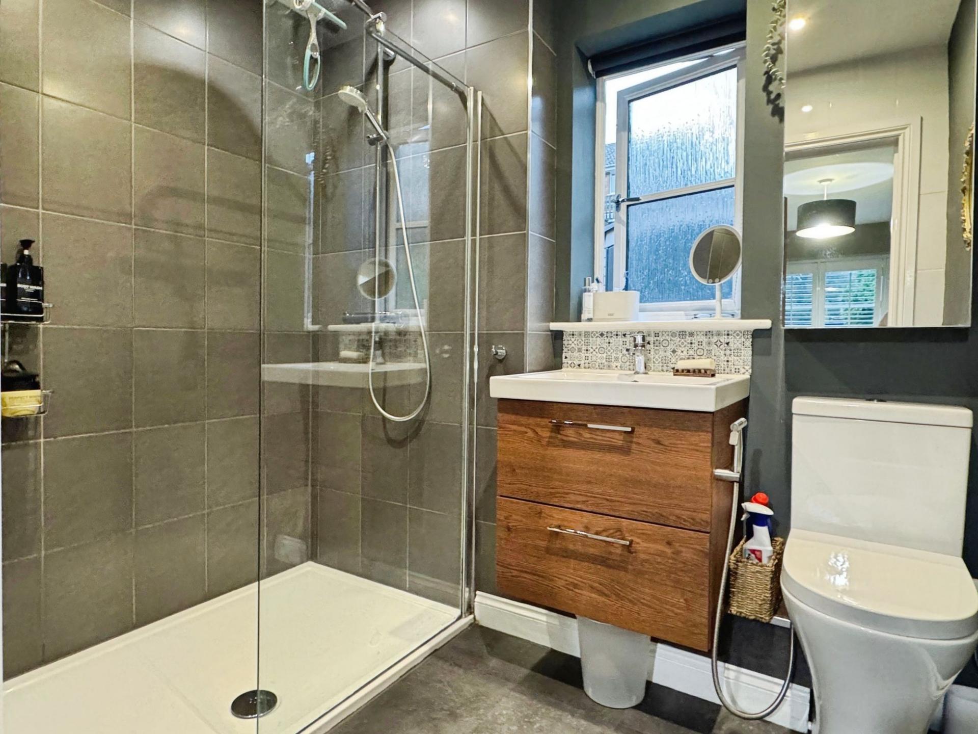 A versatile study provides an ideal space for home working or could serve as a nursery, conveniently located next to the ground floor principal bedroom suite. The principal bedroom offers generous proportions and a tiled en-suite shower room with a double shower, WC, and basin. A useful ground floor storage cupboard completes the downstairs accommodation.