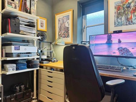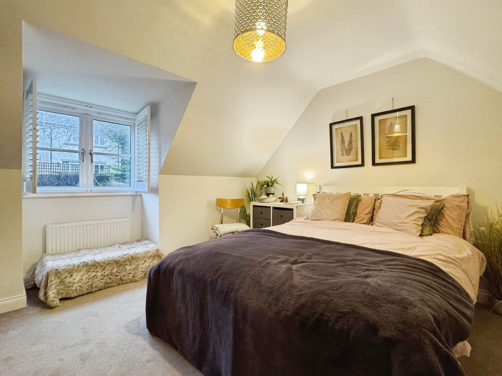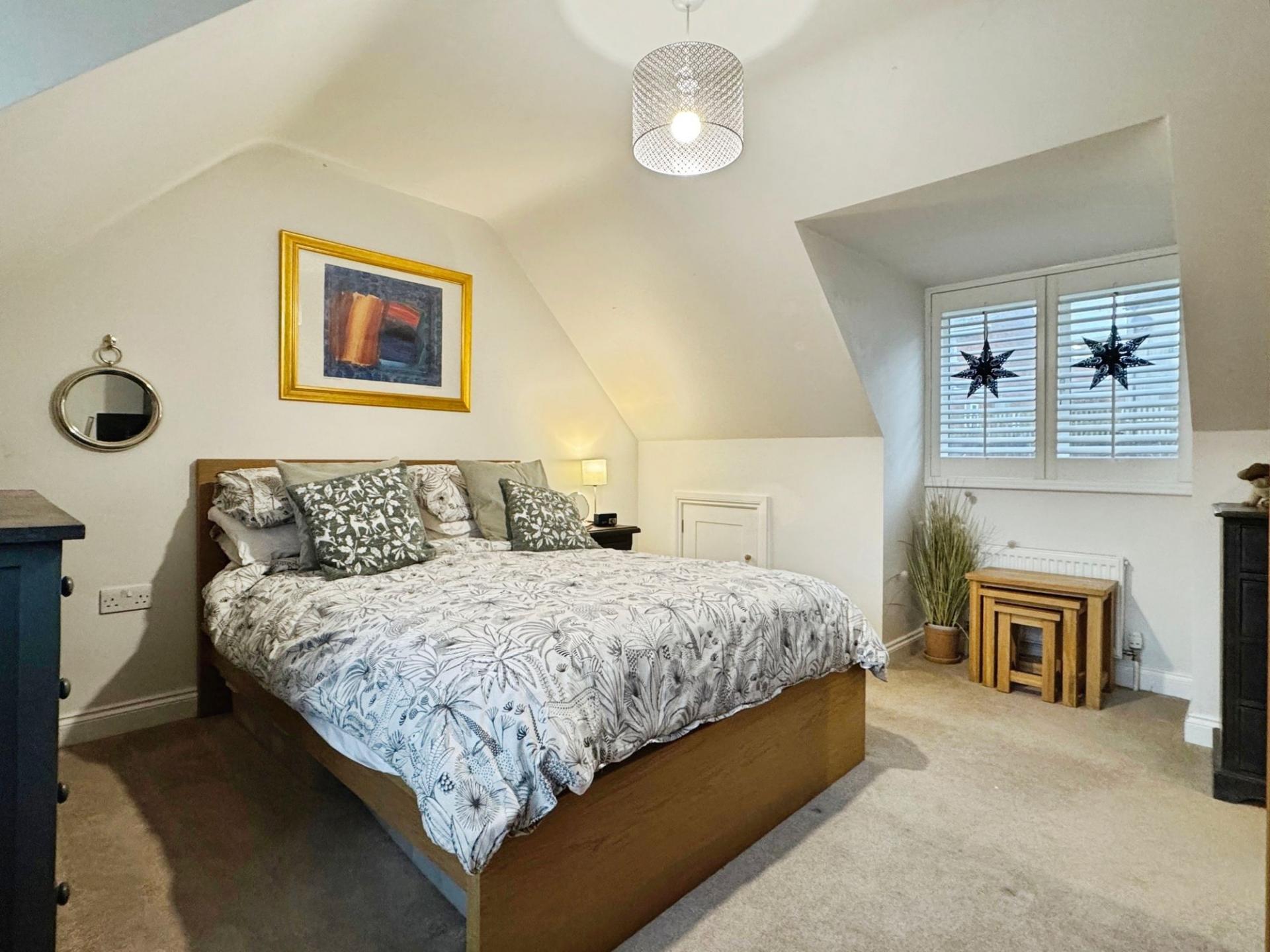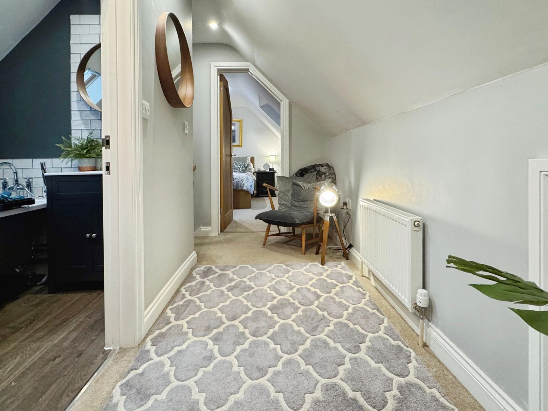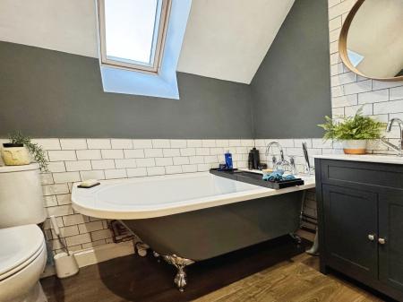 Upstairs, the entire floor is carpeted, except for the bathroom, which features engineered wood-look tiles, providing a consistent and cohesive finish throughout. There are two further double bedrooms, both with eaves storage, complemented by a sizeable loft space that offers excellent additional storage. The recently updated family bathroom is well presented and comprises a roll-top bath, WC, and basin.