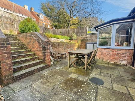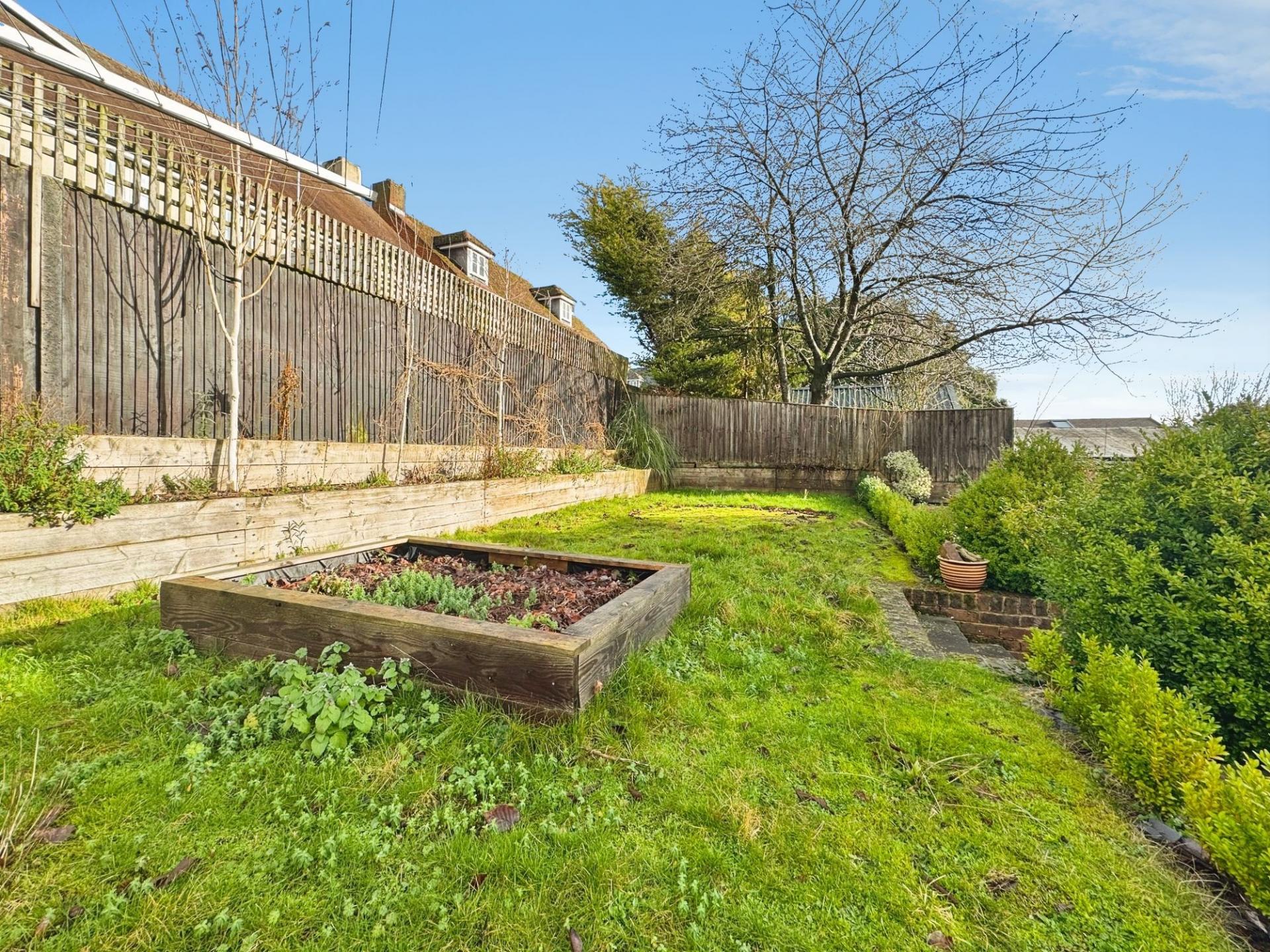 The garden is arranged over two tiers, with a lower patio area perfect for outdoor dining and a top tier leading to an elevated lawn. Designed to be low maintenance, sleeper borders, box hedging, and silver birch planting create a structured yet natural feel, while a practical shed and side access to the front provide convenience. At the front of the property, a graveled area offers ample parking for multiple vehicles. The garden is fully enclosed, ensuring privacy and security throughout.