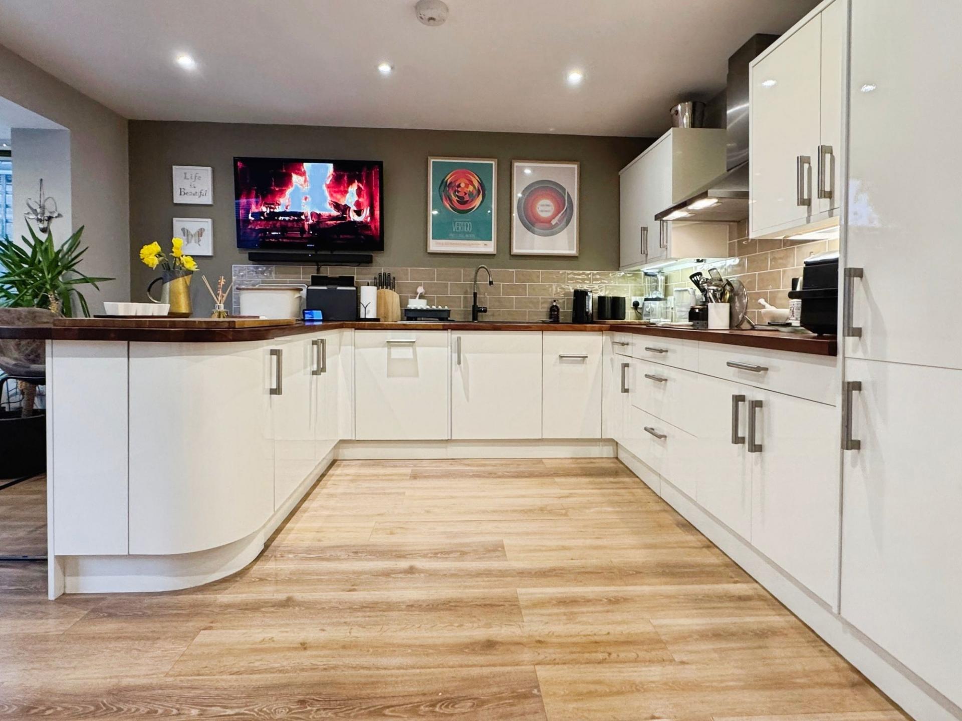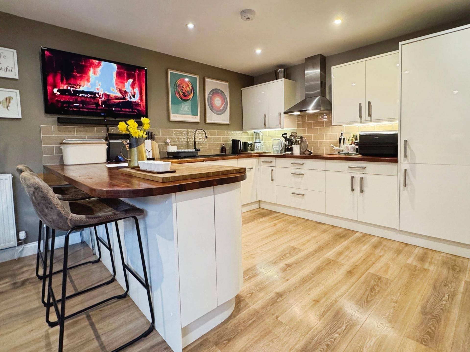 The open-plan kitchen and dining area is both stylish and practical. The kitchen is fully fitted with integrated appliances, including a fridge/freezer, BOSCH double oven, BOSCH induction hob with extractor, and a NEFF dishwasher. A large breakfast bar, wood work surfaces, metro tiling, and ample storage combine function and style. Adjoining the kitchen, a separate utility room offers an additional work surface, shelving, and a sink, with direct access to the garden. The dining area is a bright, airy space, with windows on all sides and French doors that open onto a patio, seamlessly extending the living space into a thoughtfully designed outdoor area, ideal for al fresco dining.