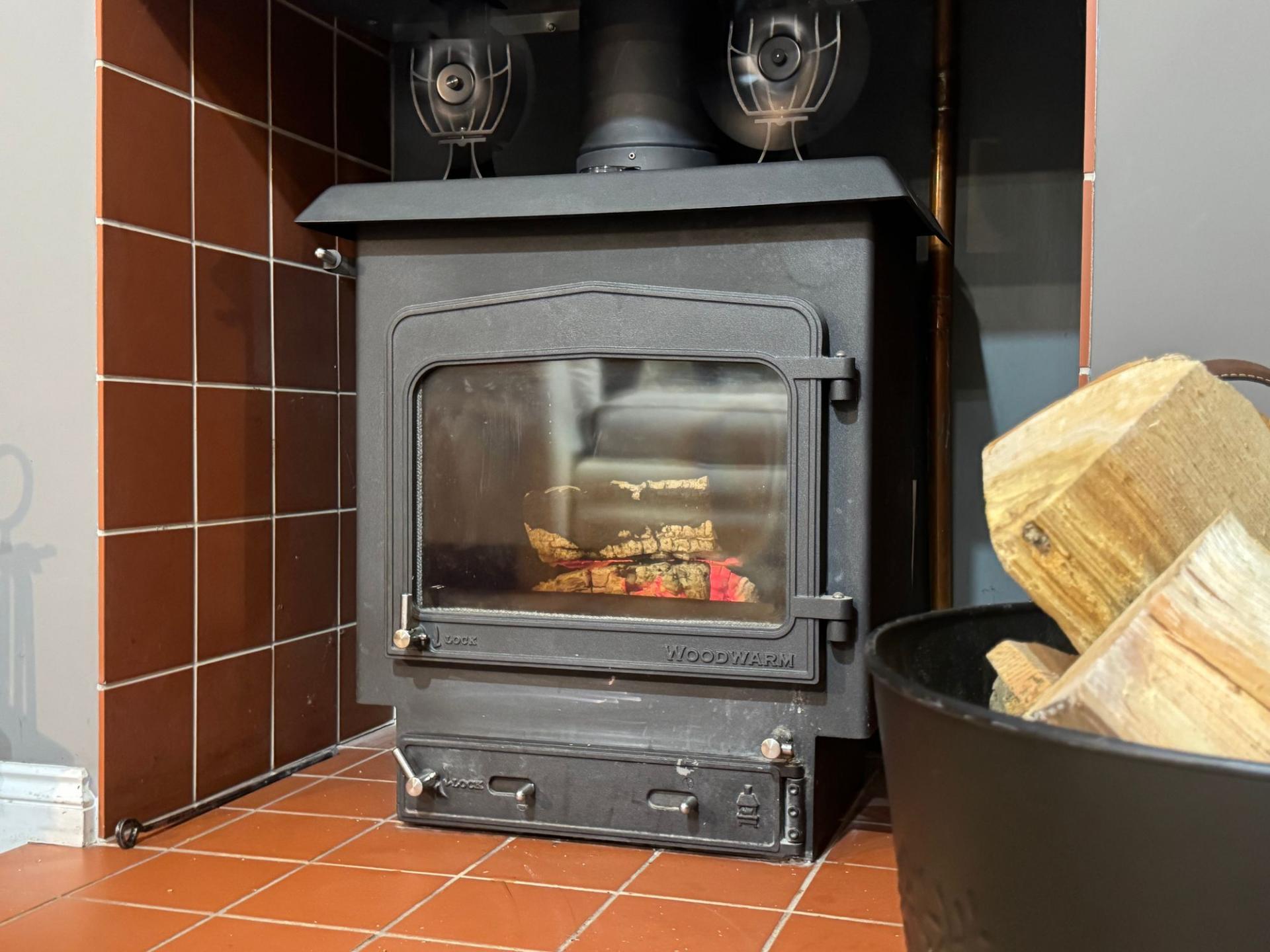 The welcoming entrance hall, with engineered wood flooring, provides access to all ground floor rooms and sets the tone for the flow of the home. The living room is a comfortable and inviting space, ideal for entertaining or relaxing, centred around a Woodwarm 9kW multi-fuel burner that forms an attractive focal point. White plantation shutters feature on every window, adding a contemporary touch while providing privacy and natural light.