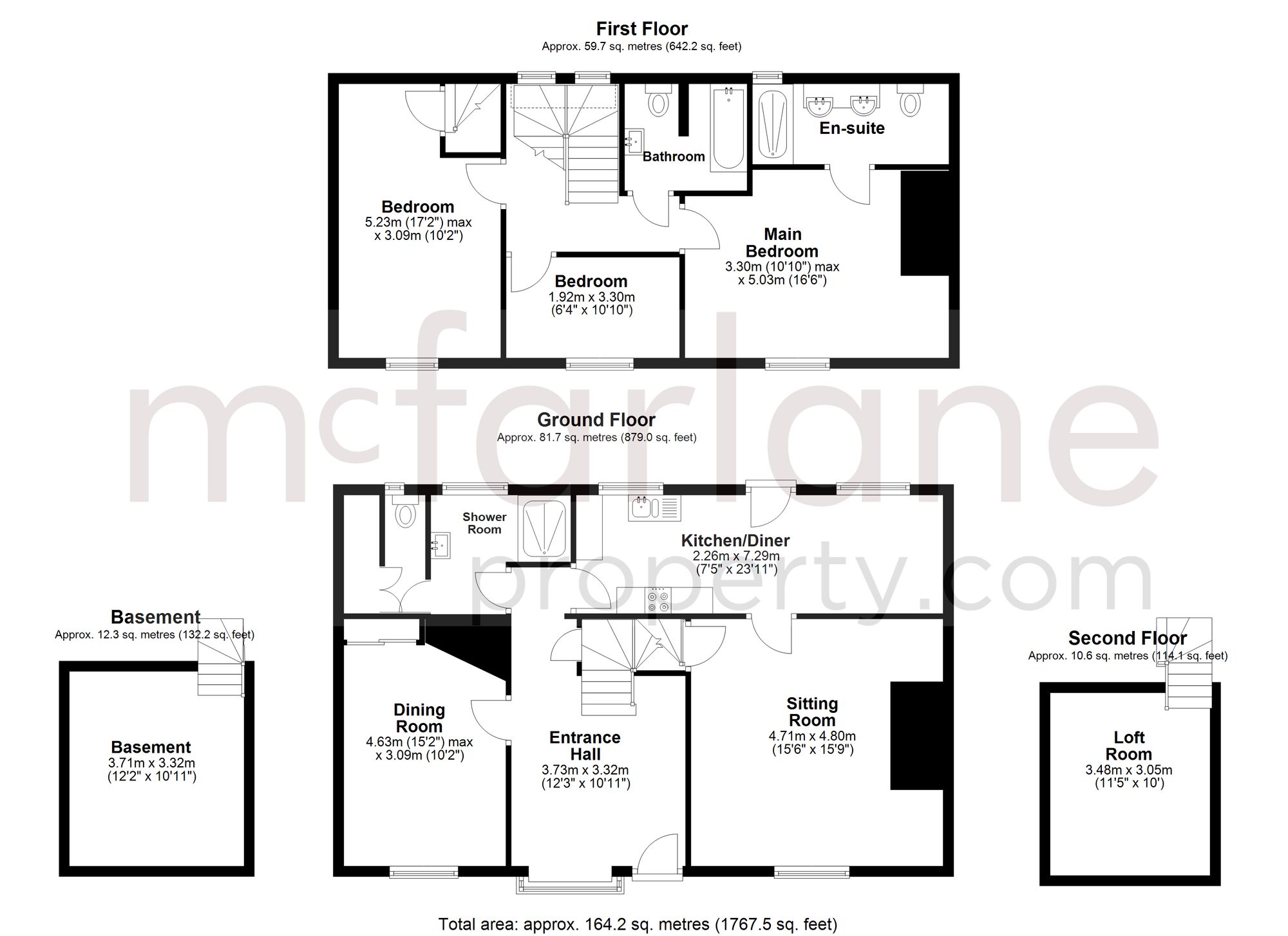 The family bathroom is neatly tiled and fitted with a bath, WC, wash basin, and heated towel rail. The main bedroom is a spacious retreat, complete with deep wardrobe storage and an en-suite showroom featuring a double shower cubicle, twin sinks, and additional storage cupboards.
