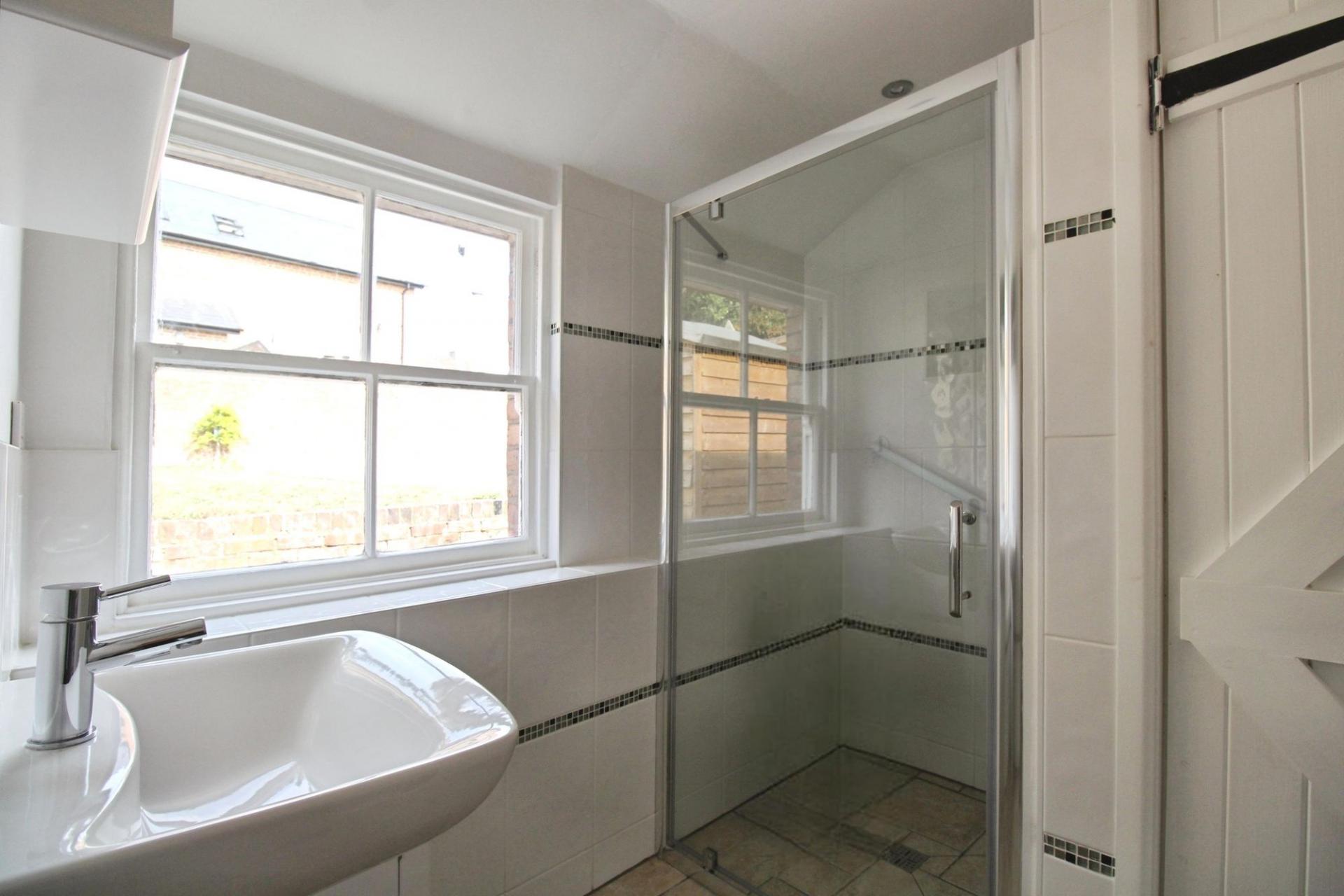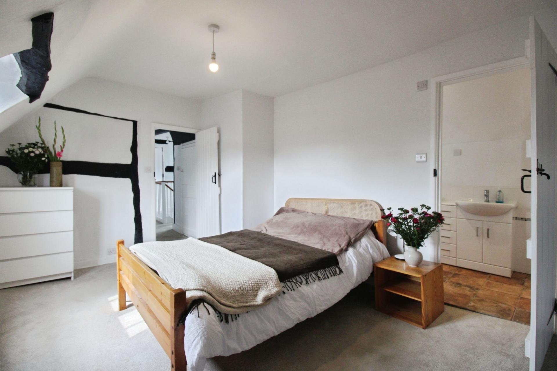 The carpeted staircase rises to a light-filled landing, with whitewashed walls and exposed black beams adding striking character. The first floor is fully carpeted, creating a warm and inviting feel throughout. To the right is the second bedroom, a generous double with access to an ancient staircase that leads to the heavily beamed loft. The third bedroom, a comfortable single with a front-facing window, enjoys views towards St Peter’s Church and The Green.