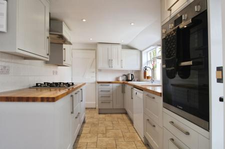 The kitchen is well presented, featuring tiled flooring, wooden worktops, a Belfast sink, Bosch double oven, gas cooker, and integrated appliances. It opens into a bright breakfast room with direct garden access. Beyond this lies the generous sitting room, a superb reception space with a front-facing window, open fireplace, and large storage cupboard with trap door to the cellar beneath the entrance hall.