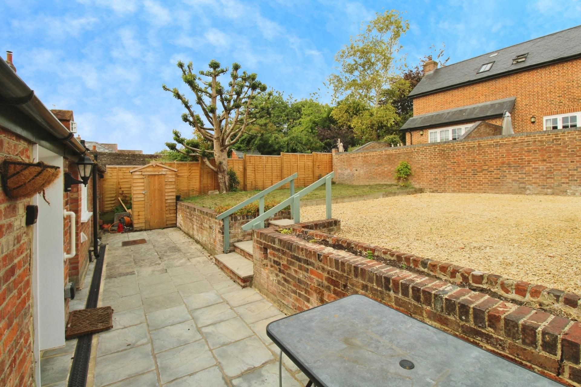 From the kitchen, steps lead out to a good-sized paved patio, perfect for outdoor dining. Beyond lies a gravelled parking area for up to three cars, opening onto Blowhorn Street, all enclosed by attractive brick walls in keeping with the cottage’s character. The north-facing garden is mainly laid to lawn and features a well-maintained Ficus tree, creating a peaceful outside space.