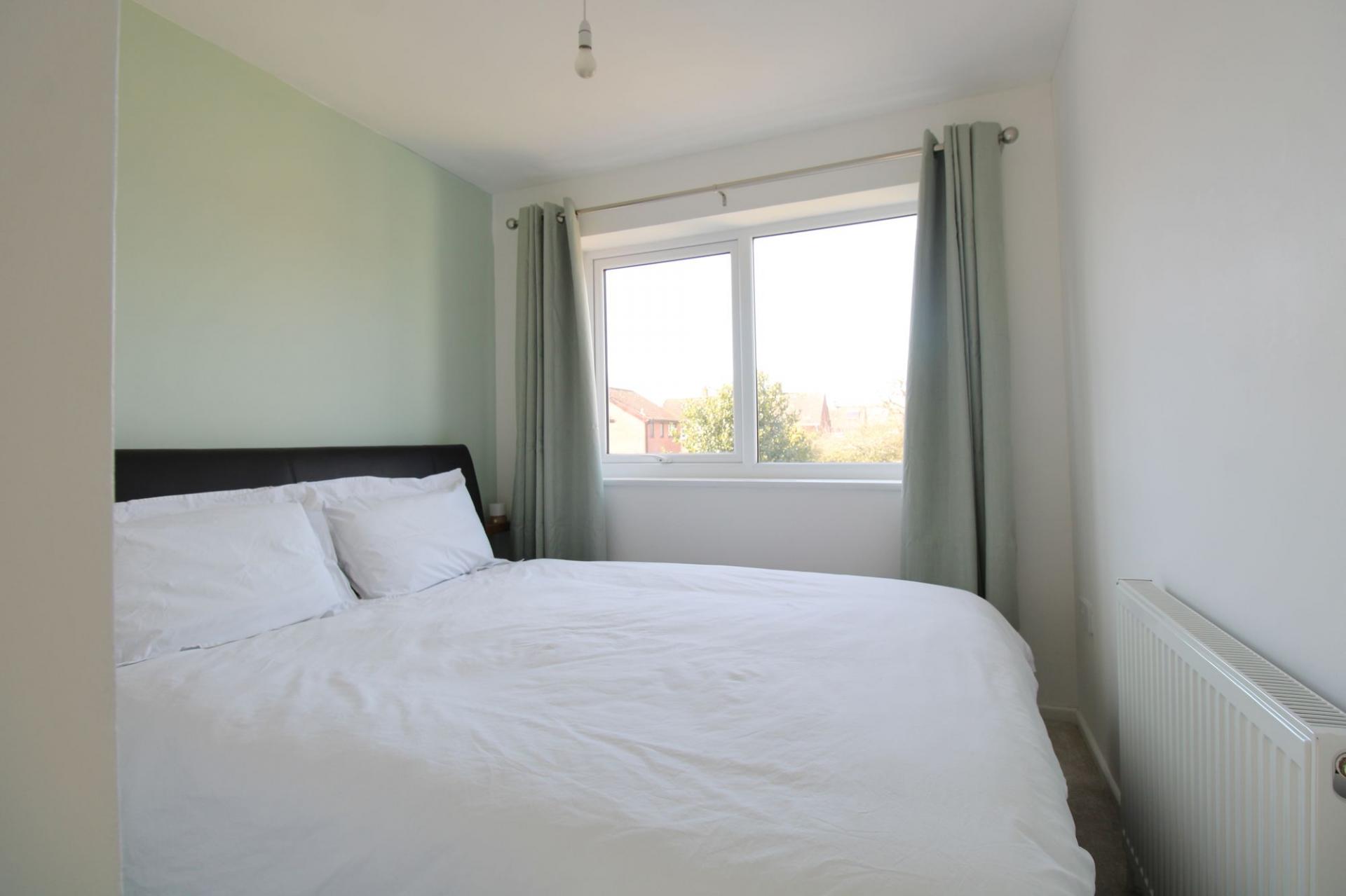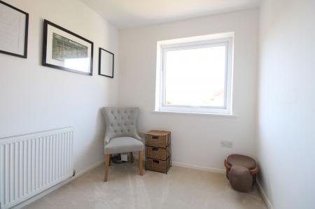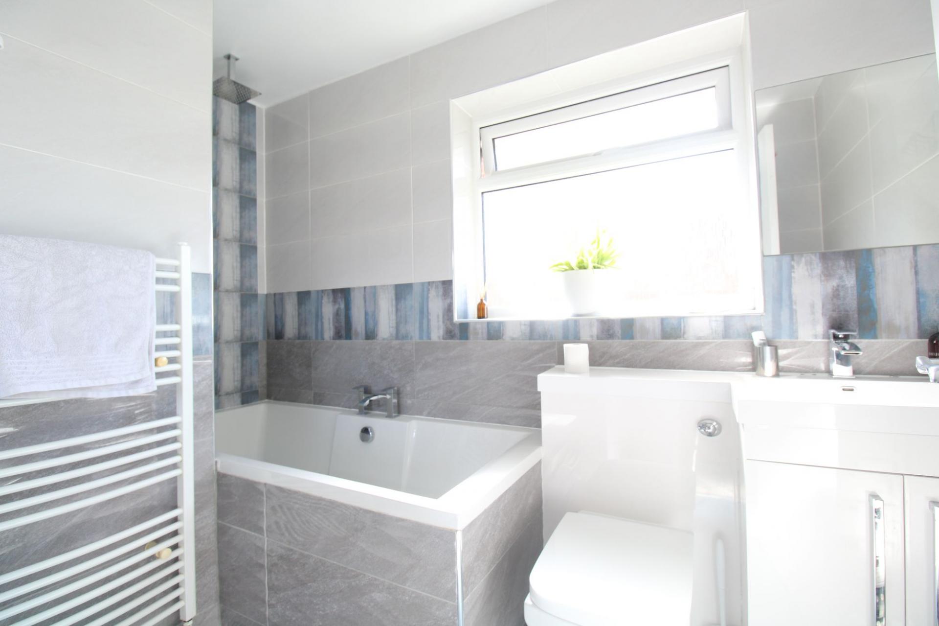 Upstairs, three tastefully decorated bedrooms provide comfortable and versatile living spaces. The master bedroom benefits from plush carpeting, large double-glazed windows, and an impressive fitted wardrobe with mirrored sliding doors. The two additional bedrooms offer flexibility, ideal for family members, guests, or a home office. The stylish bathroom is fully tiled and features a spacious bathtub with an integrated rainfall shower, a frosted window, a hand wash basin, and a low-level WC. Additional storage is available via an over-stairs cupboard on the landing.