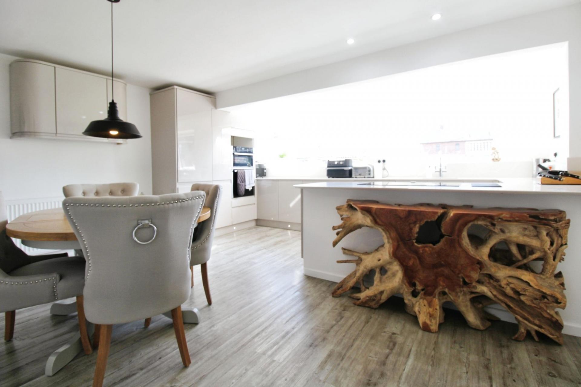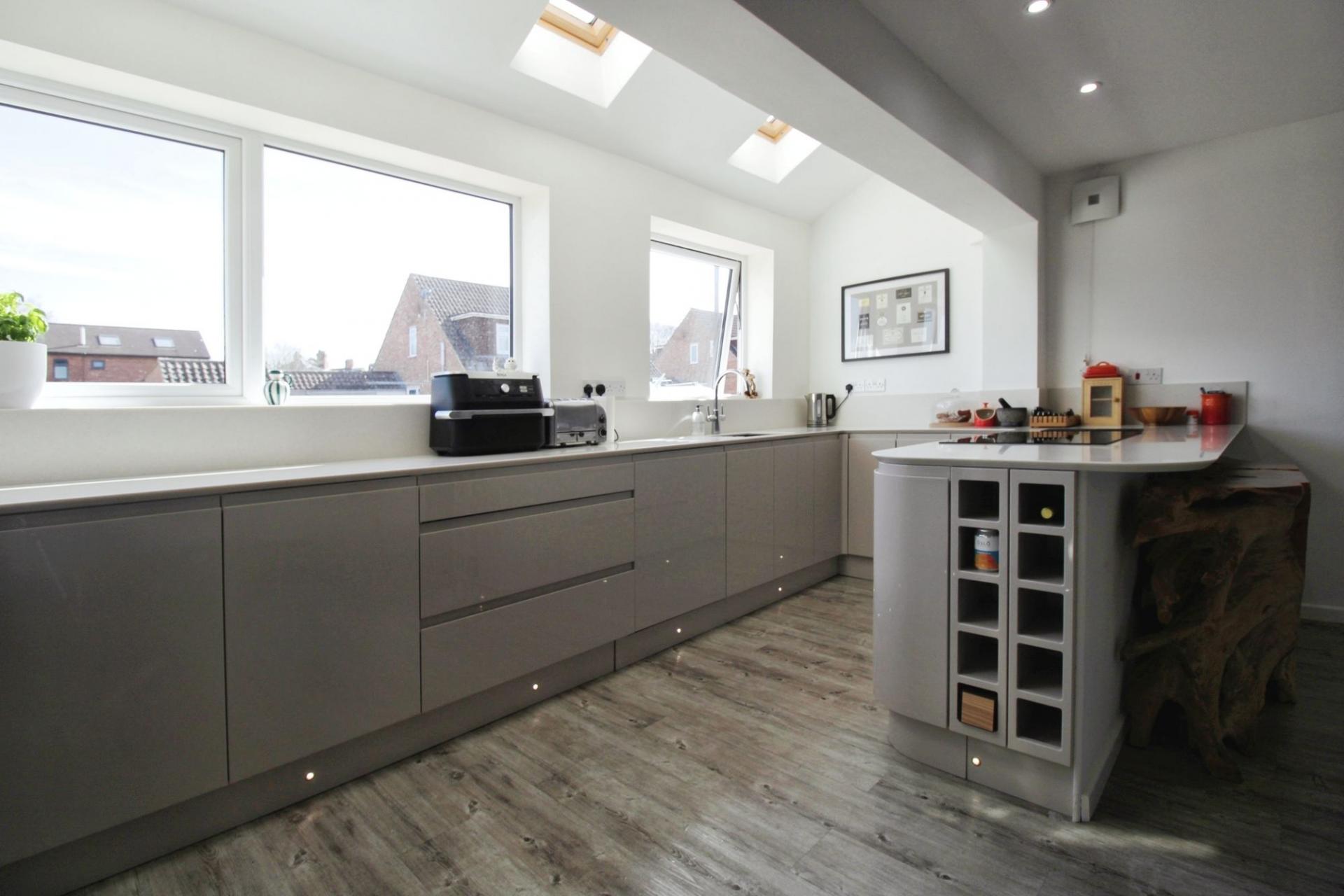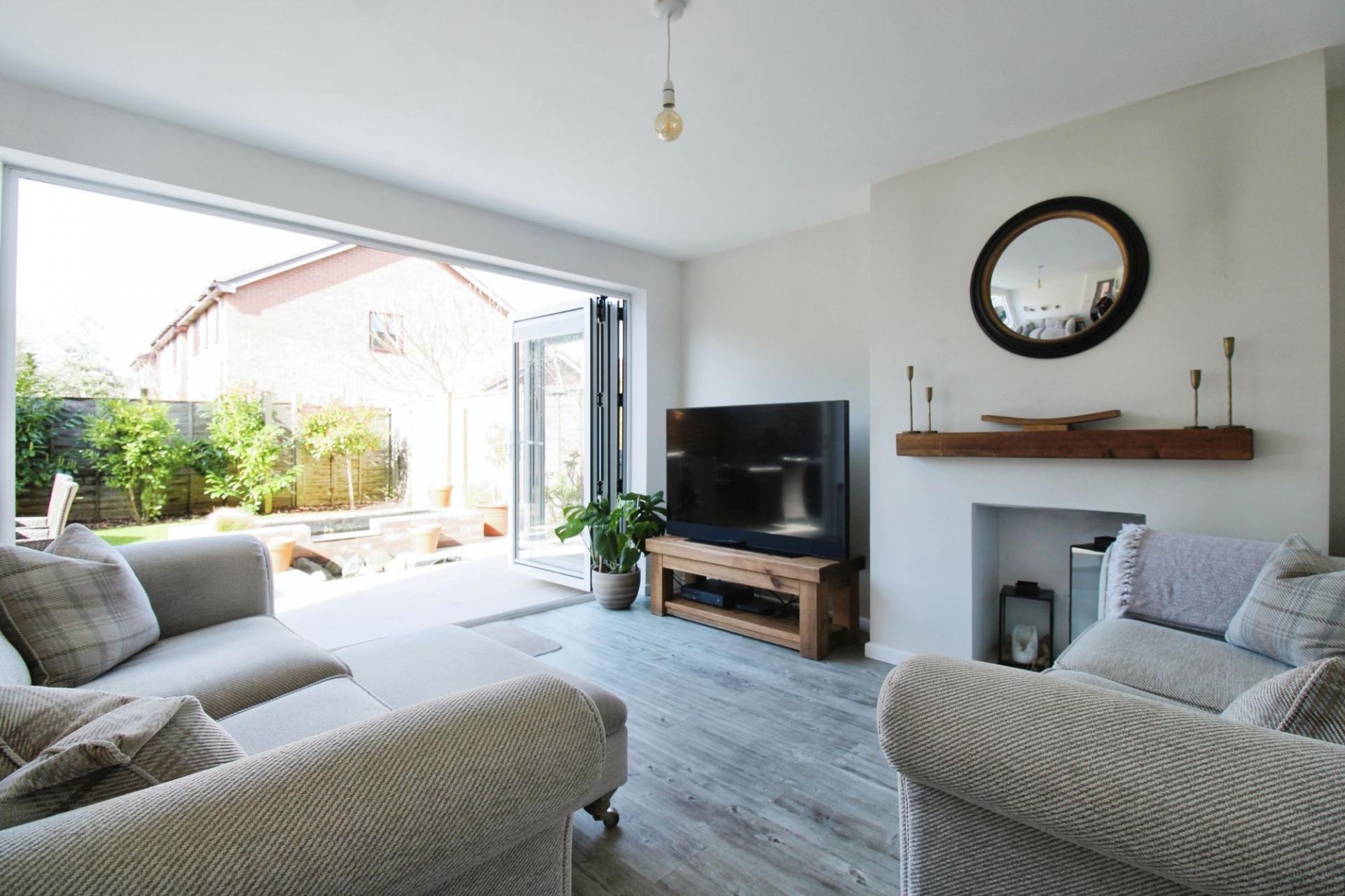 Presented to an exceptional standard, this home is both stylish and low-maintenance. The inviting lounge is bathed in natural light, thanks to expansive 3m bifold doors. A chic feature mirror radiator adds to the contemporary feel, while a non-working fireplace provides a charming focal point.