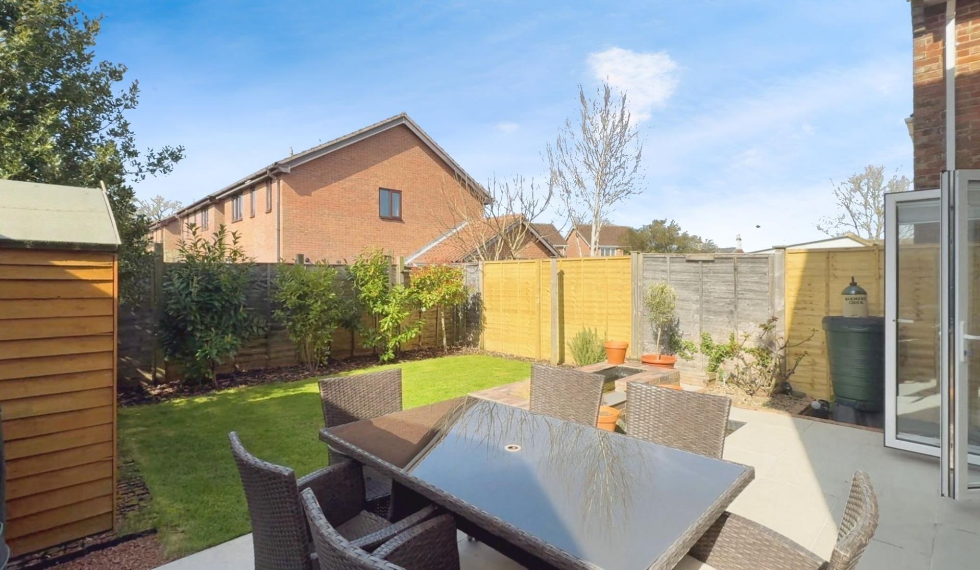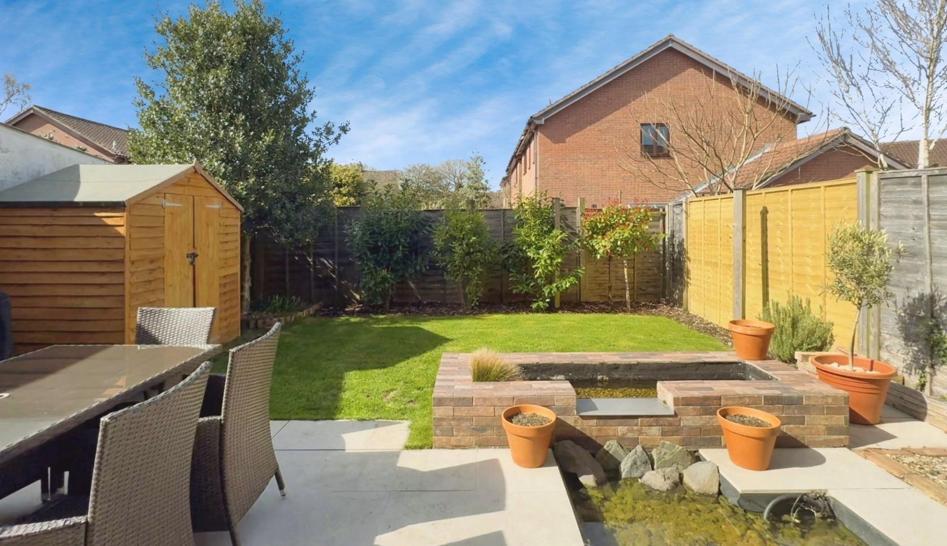 The exterior is just as impressive, featuring a beautifully landscaped, easy-to-maintain garden with a striking porcelain-tiled patio, a pond, and a tranquil water feature—perfect for outdoor relaxation. A shed provides ample storage for garden equipment, while fencing and hedges along the borders ensure privacy. Electrical sockets are conveniently placed for outdoor power. The west-facing garden enjoys plenty of sunshine throughout the day. A side entrance provides easy access, and the opposite side of the property includes a useful outdoor storage area, ideal for bicycles and gardening tools.