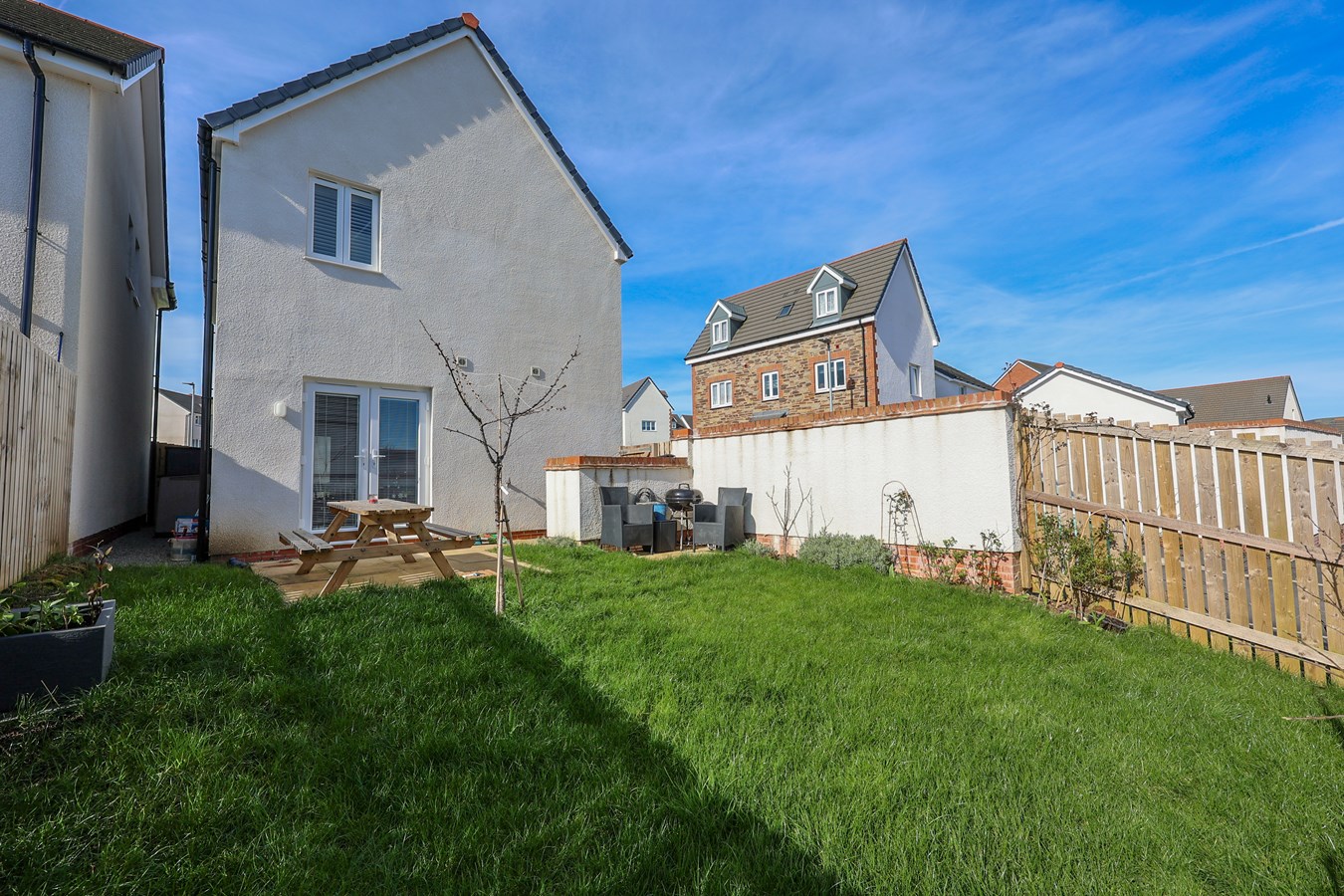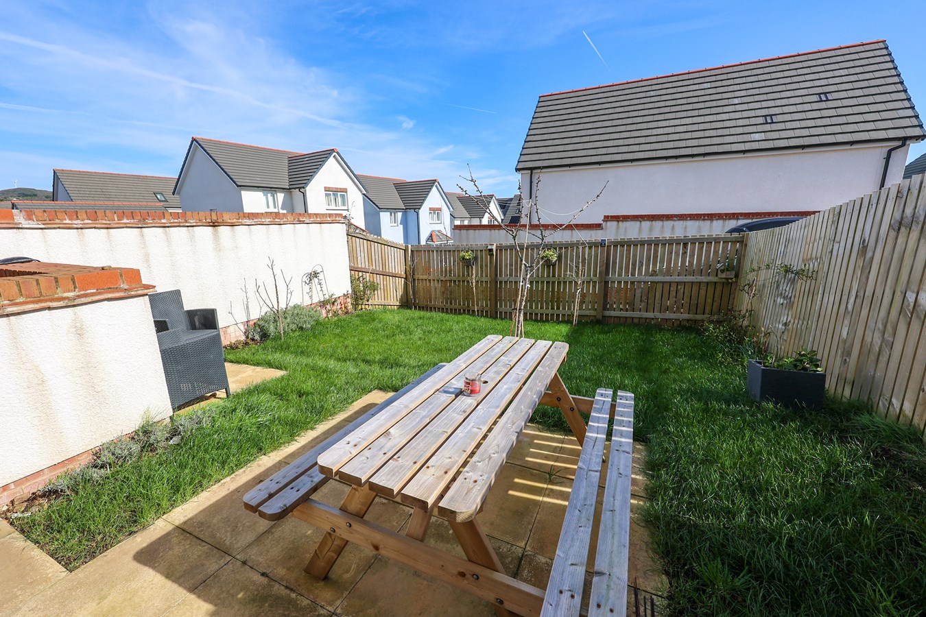 To the front and right-hand side, a neat, level garden is attractively planted with a variety of shrubs, creating a welcoming first impression. The main garden, positioned to the lower left, features a paved patio?perfect for outdoor dining?leading onto a well-kept lawn, ideal for relaxing or family use.
