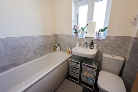 Window to the front, fitted with a three piece White suite comprising of a panelled bath with a mixer tap, partially tiled, low level WC, wash hand basin, extractor fan.