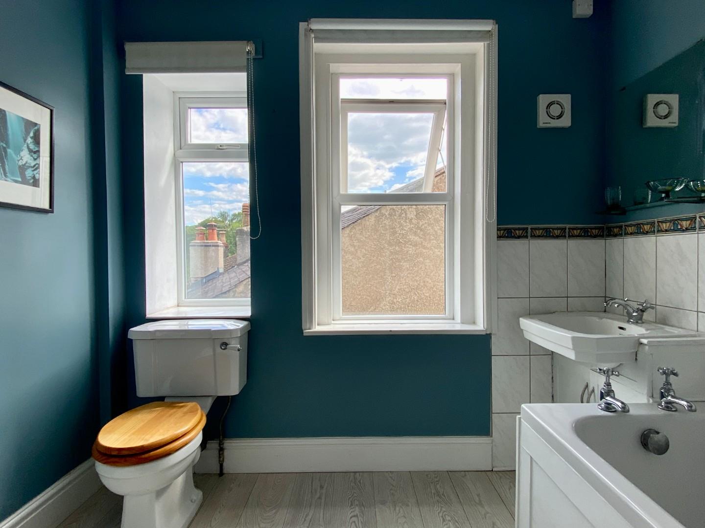Bathroom - 2.60m x 2.40m (8'6" x 7'10") - Having two windows to the side aspect, this well proportioned bathroom, with laminate flooring, is fitted with a three piece suite comprising low flush WC, wash hand basin with vanity unit beneath and a panelled bath with electric shower over.