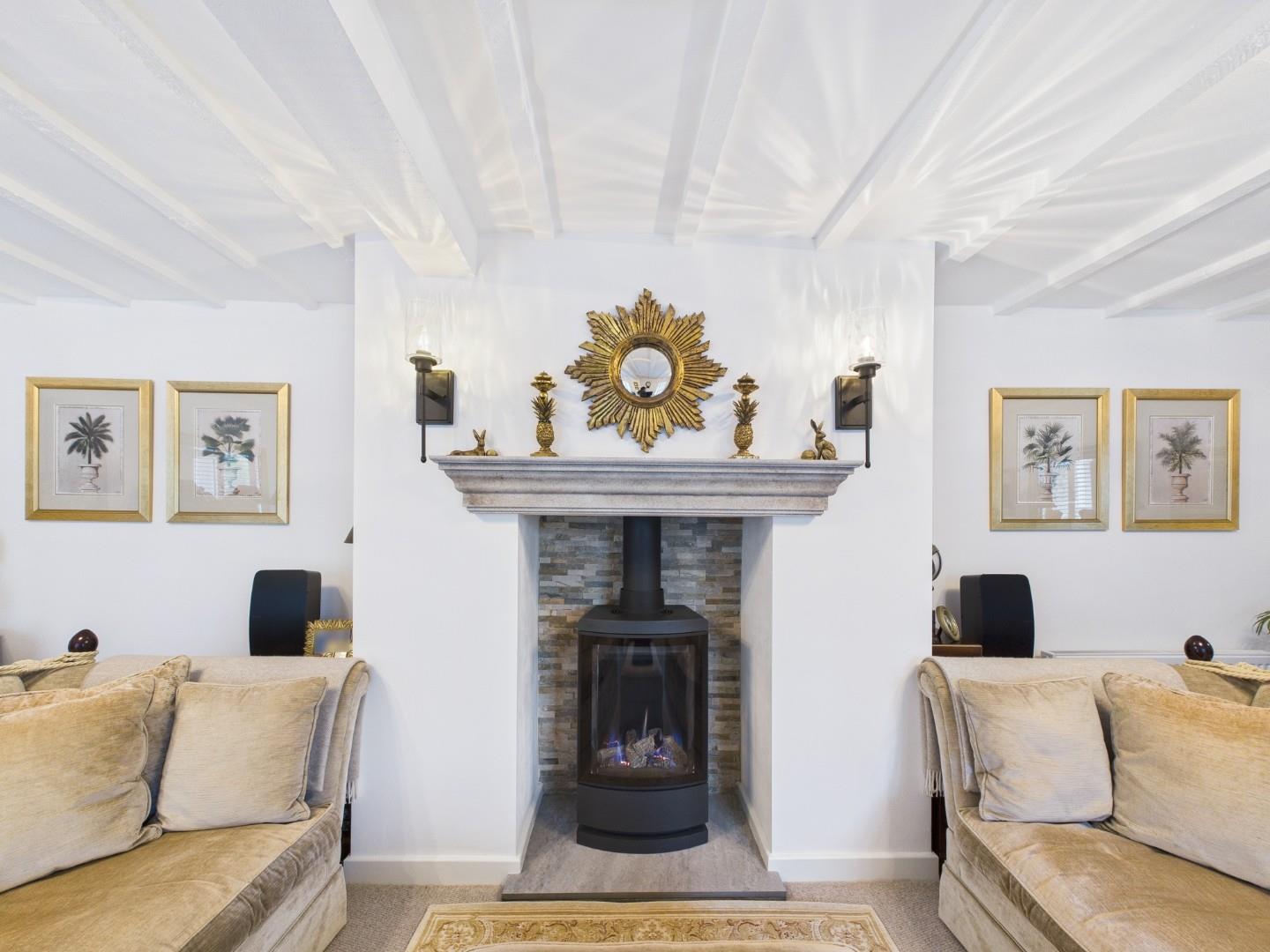 Living Room - 6.43 x 3.56 (21'1" x 11'8") - This room showcases the home's period charm with full-height double-glazed sash windows, enhanced by secondary glazing for added warmth. Wooden shutters frame striking garden views, while painted ceiling beams and a feature fireplace with contemporary gas stove lend a cosy, yet modern feel. It's a space that truly leaves a lasting impression.