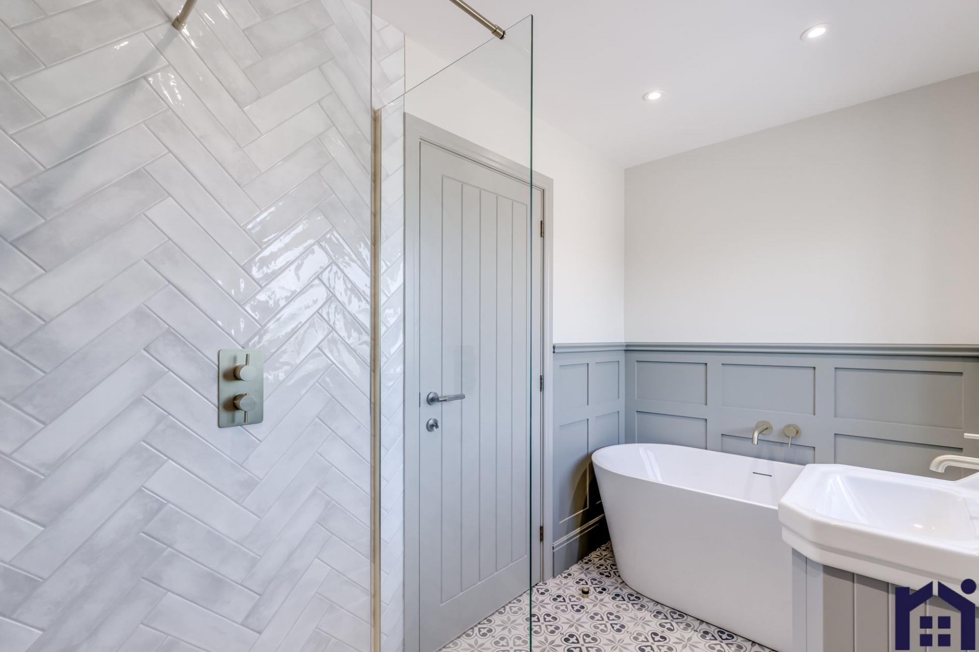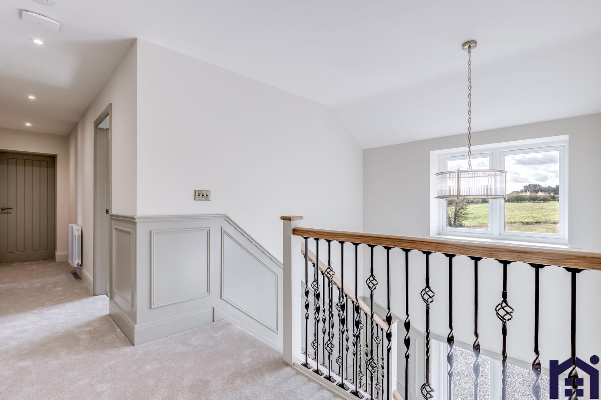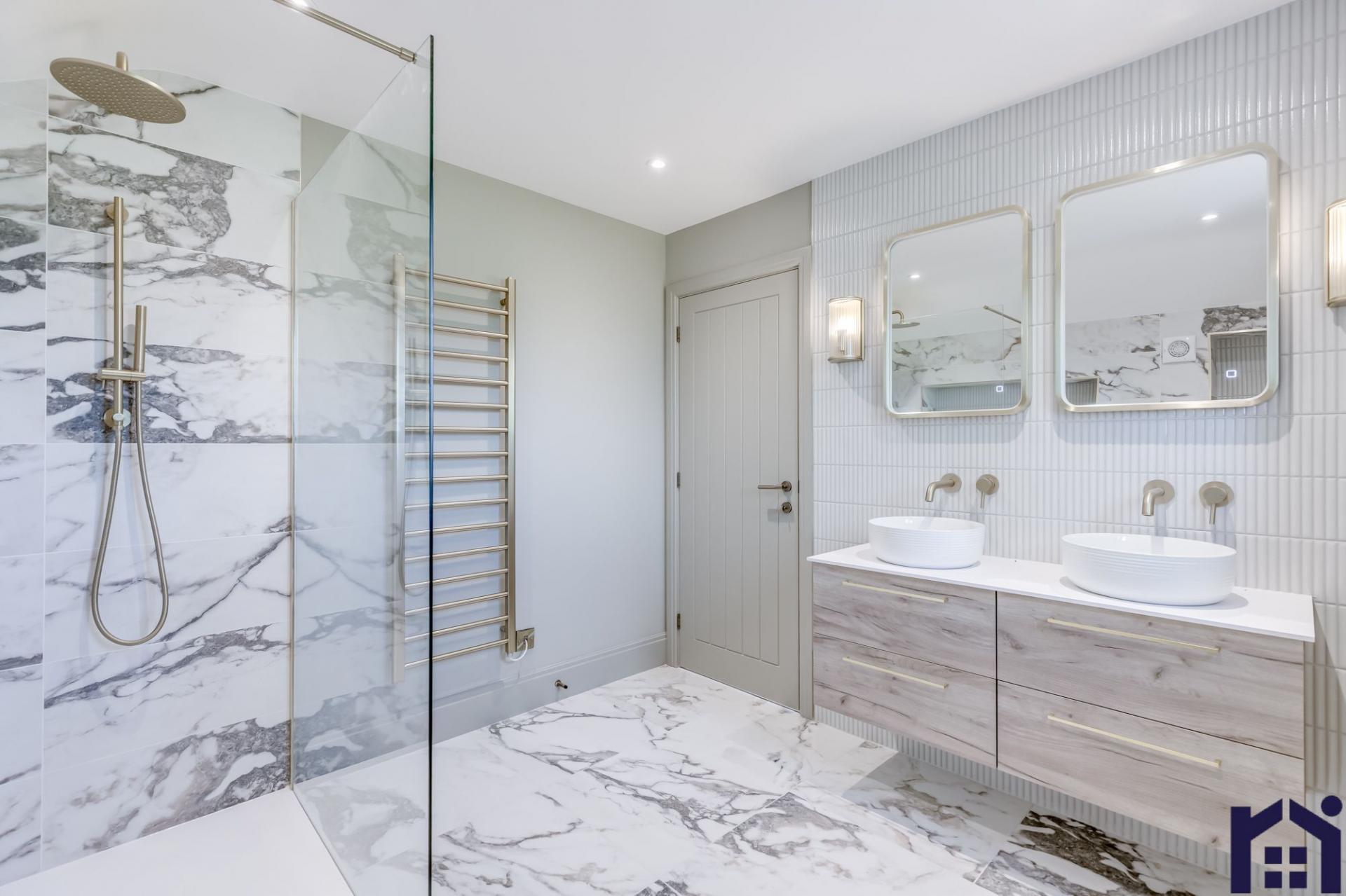 Back inside, elegant oak and iron stairs with runner lead up to the first floor where the spacious landing gives access to all rooms. The master suite has windows to two elevations, walk in dressing room and sumptuous en suite comprising twin floating wash hand basins, rainfall mixer shower in walk in cubicle, wc and ladder heated towel rail. Bedroom two also benefits from en suite making it a model guest suite if required. There are two further double bedrooms with the family bathroom comprising panelled walls, bath, wash hand basin on vanity, floating wc, rainfall mixer shower in walk in cubicle and ladder heated towel rail.