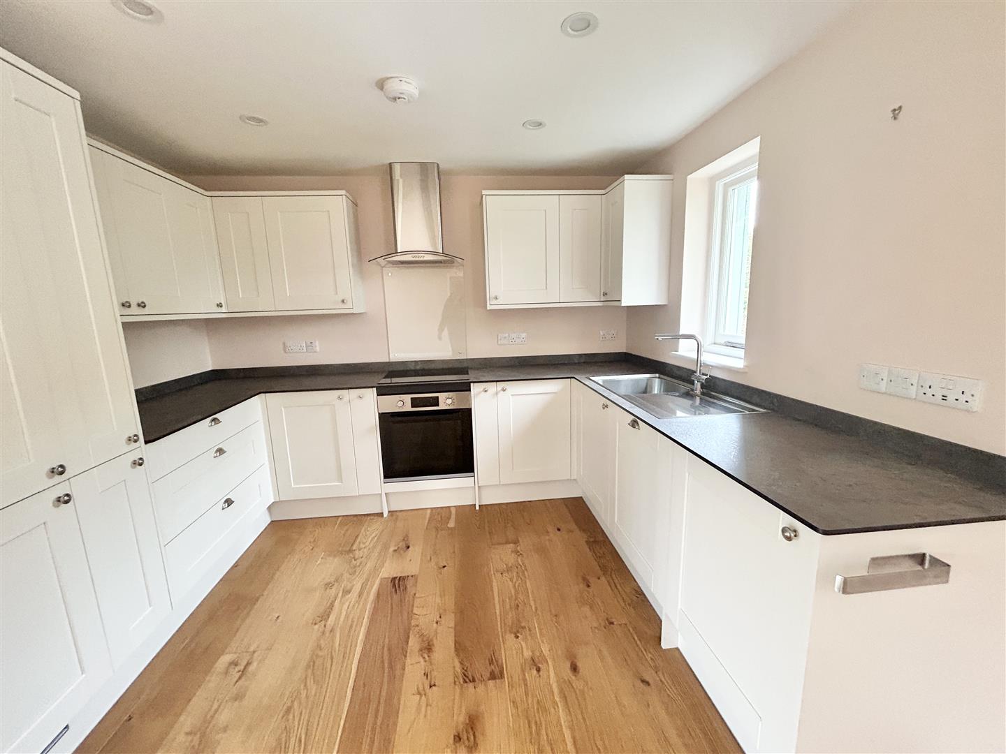 Kitchen - 3.20 x 2.62 (10'5" x 8'7") - With a beautifully appointed cream shaker style kitchen comprising granite effect worktops that incorporate a sink drainer unit with mixer tap, touch control ceramic hob with glass splashback and stainless steel and glass chimney hood over. There are a mix of base and drawer units under, wall units over, built-in appliances include a fridge/freezer, stainless steel and glass oven, dishwasher and washing machine. Engineered oak flooring and a window to the side aspect.