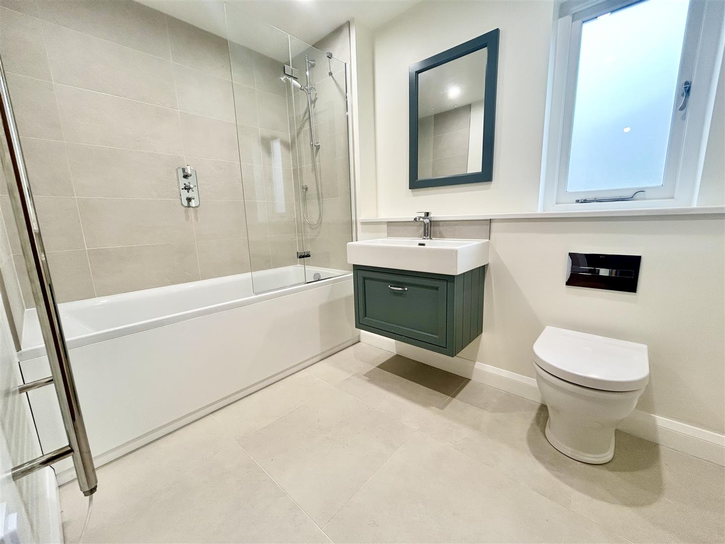 Lower Ground Floor Bathroom - Being beautifully appointed, this contemporary bathroom comprises a paneled bath with glass screen and attractive tiled splashbacks with shower over. Wall mounted wash hand basin with vanity unit under, dual flush concealed cistern w.c., ladder style drying radiator, extractor and an obscure window to the side aspect.