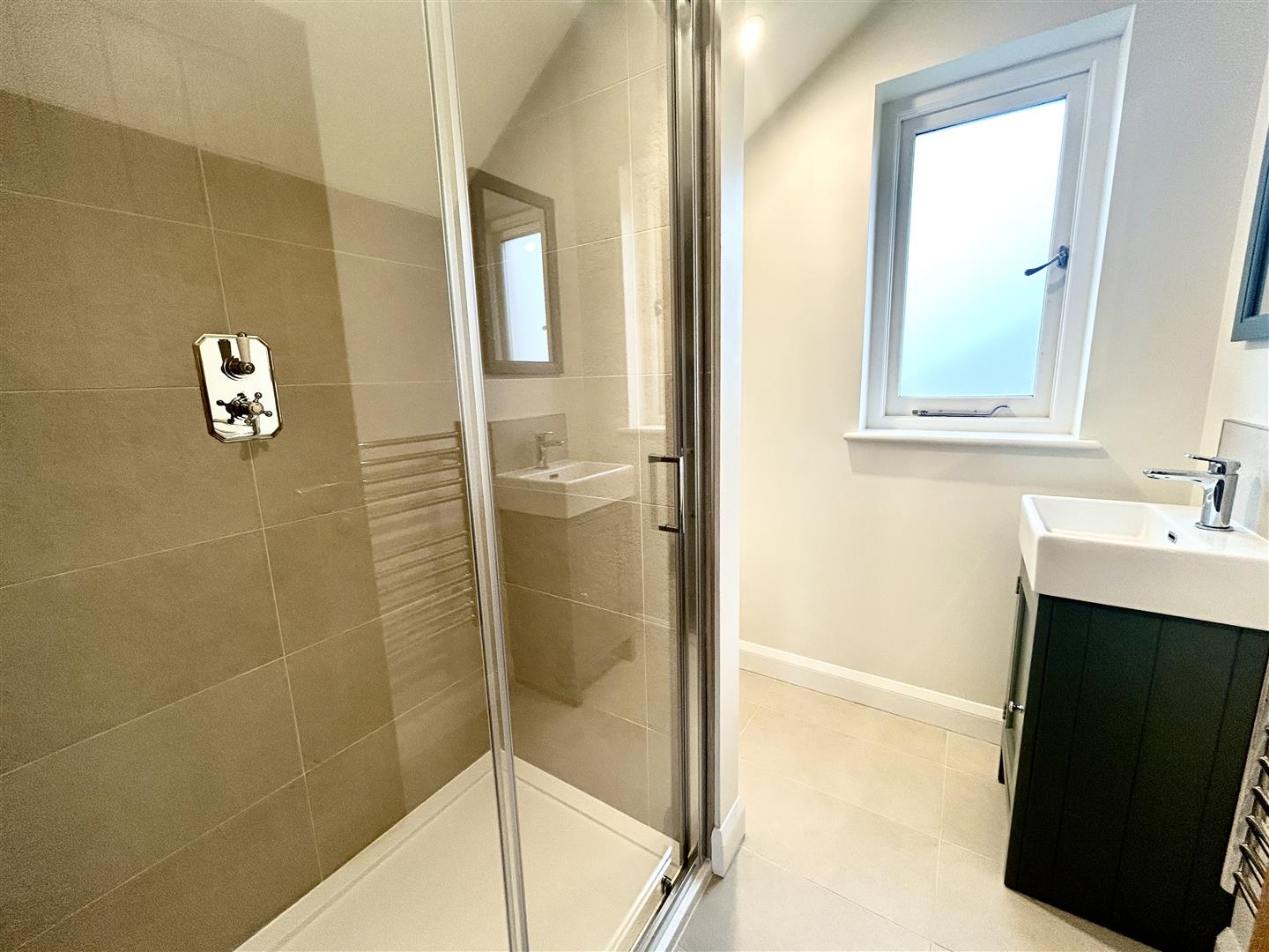 En-Suite Shower Room - Being beautifully appointed with a generous glazed and tiled walk-in shower cubicle with rainforest style drencher head and further hand held wand. A wall mounted wash hand basin with a vanity unit under, concealed cistern dual flush w.c. A ladder style drying radiator and attractive tiling to the floor.
