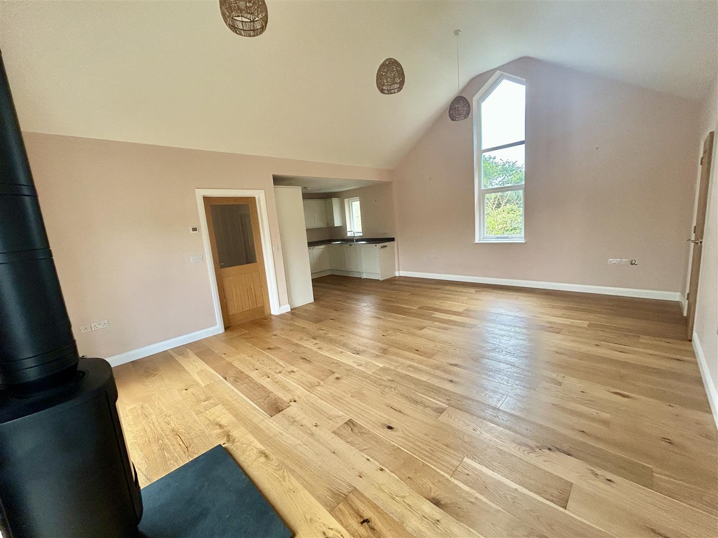 Lounge Area - 6.25 x 4.77 (20'6" x 15'7") - With a vaulted ceiling, engineered oak flooring being triple aspect with windows and a glazed sliding door with vistas out over the garden. There is an impressive woodburner set on a slate hearth.