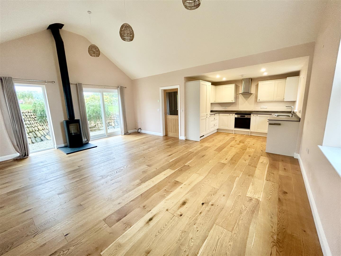 Open Plan Living Area - A super contemporary space with vaulted ceilings and multiple windows and a glazed door giving it a lovely light and airy feel.
