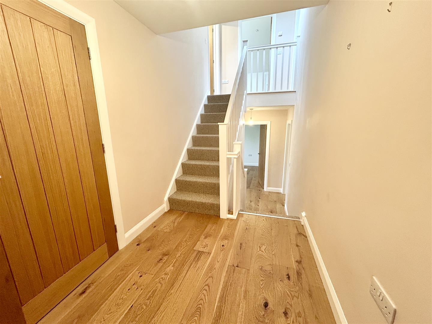 Entrance Hallway - With a generous double door storage cupboard with coat hanging space and a part glazed engineered oak door to the open plan living area.