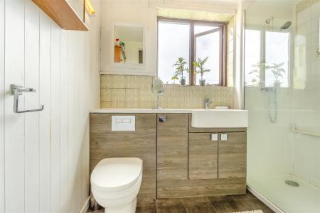 Shower Room - Fitted double shower cubicle and tray, shower, tiled surround, wash hand basin, tiled splashback, close coupled WC, rear aspect window with a lovely outlook. Part glazed door through to: