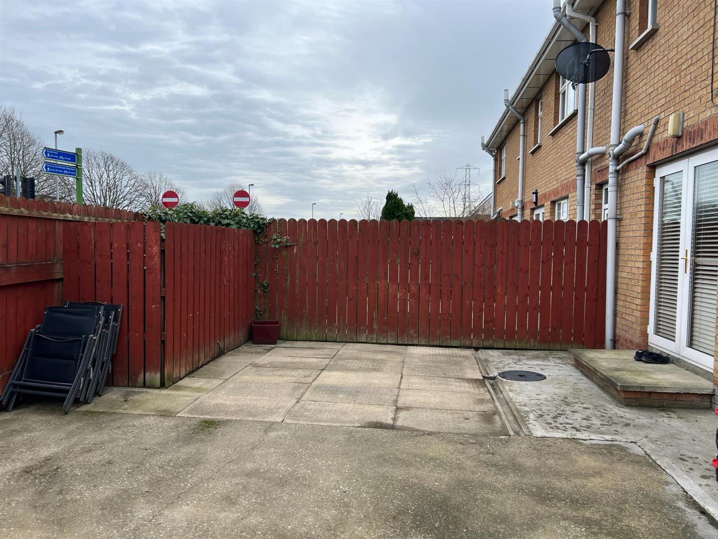 Paved patio area to rear enclosed by fence and gate.