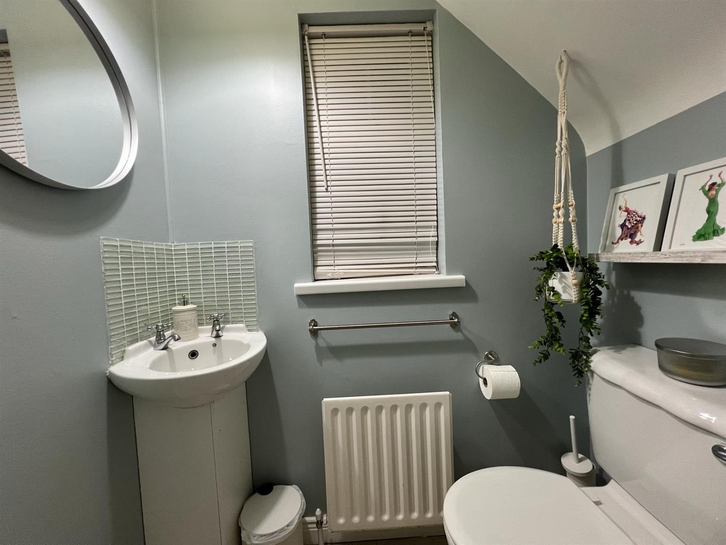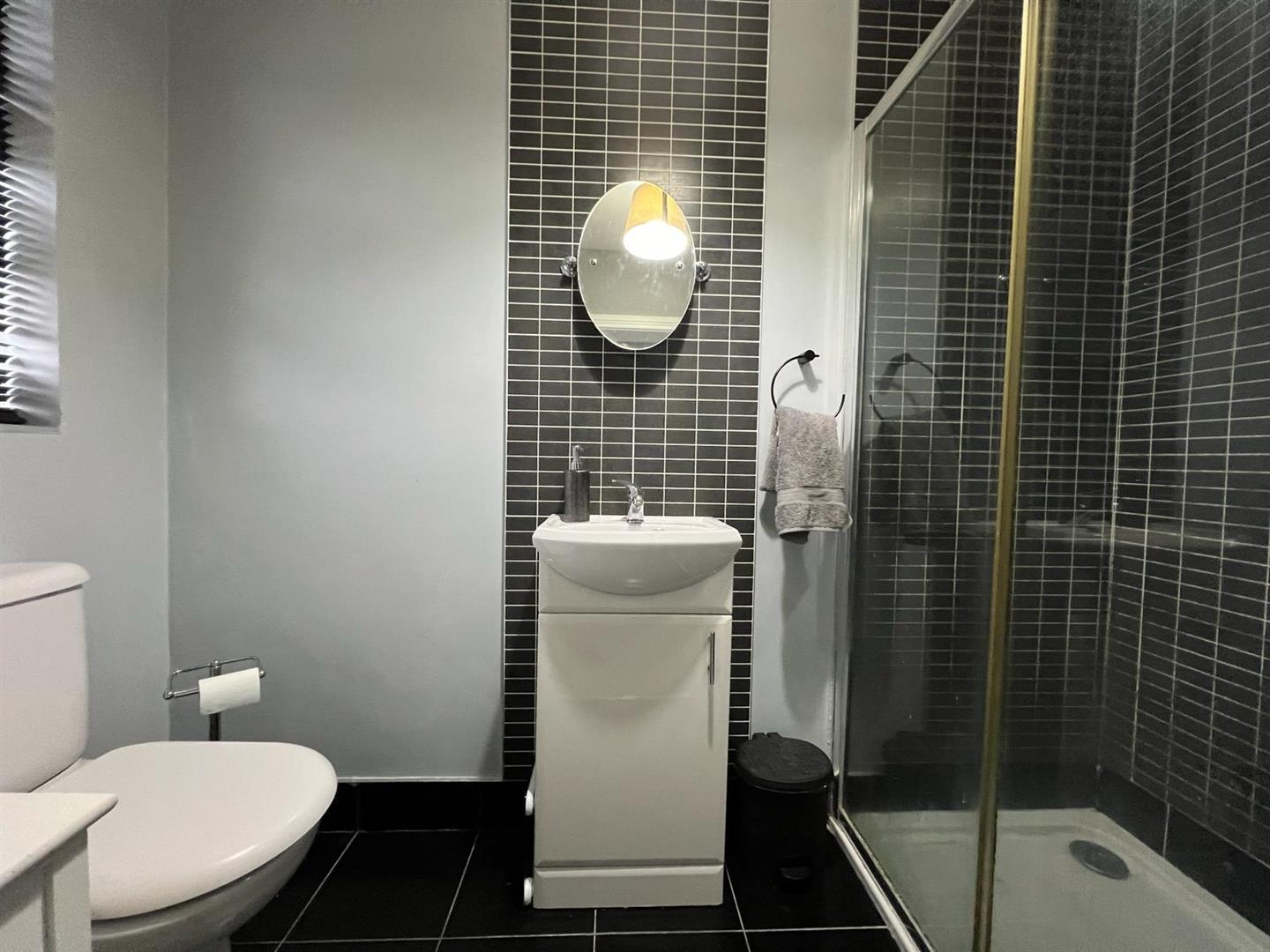 Comprising walk in electric shower, whb and wc, chrome radiator, partly tiled walls, tiled floor.