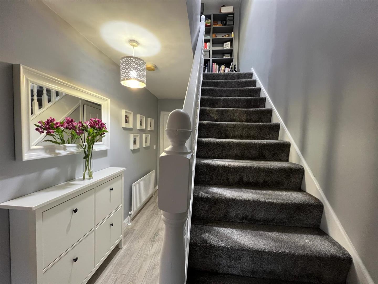 Having understairs storage and laminated woden floor.