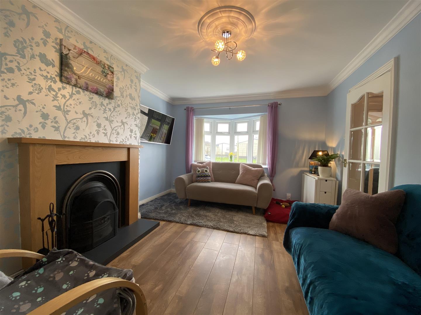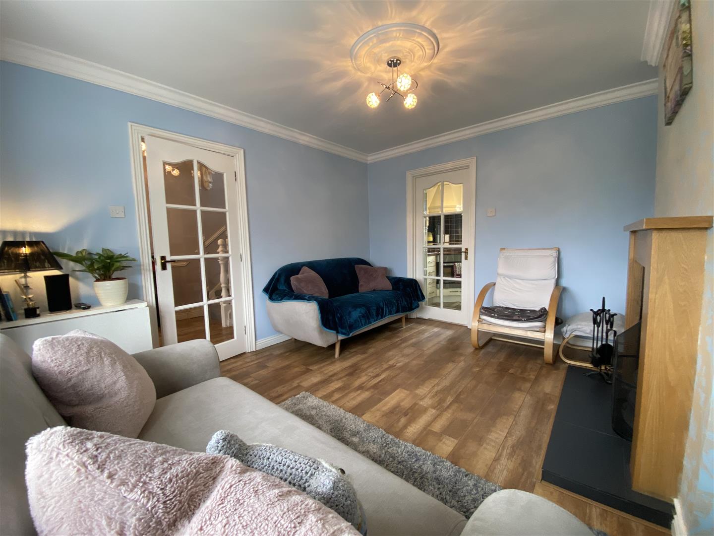 3.99m x 3.48m (13'1" x 11'5") - Having attractive fireplace with back boiler, ceiling cornicing, glazed door leading to hall and kitchen, laminated wooden floor.