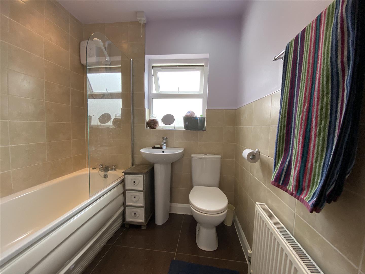 Comprising bath with electric shower over, shower screen, part tiling around bath, whb and wc, remaining walls 1/2 tiled, tiled floor, recessed lighting.